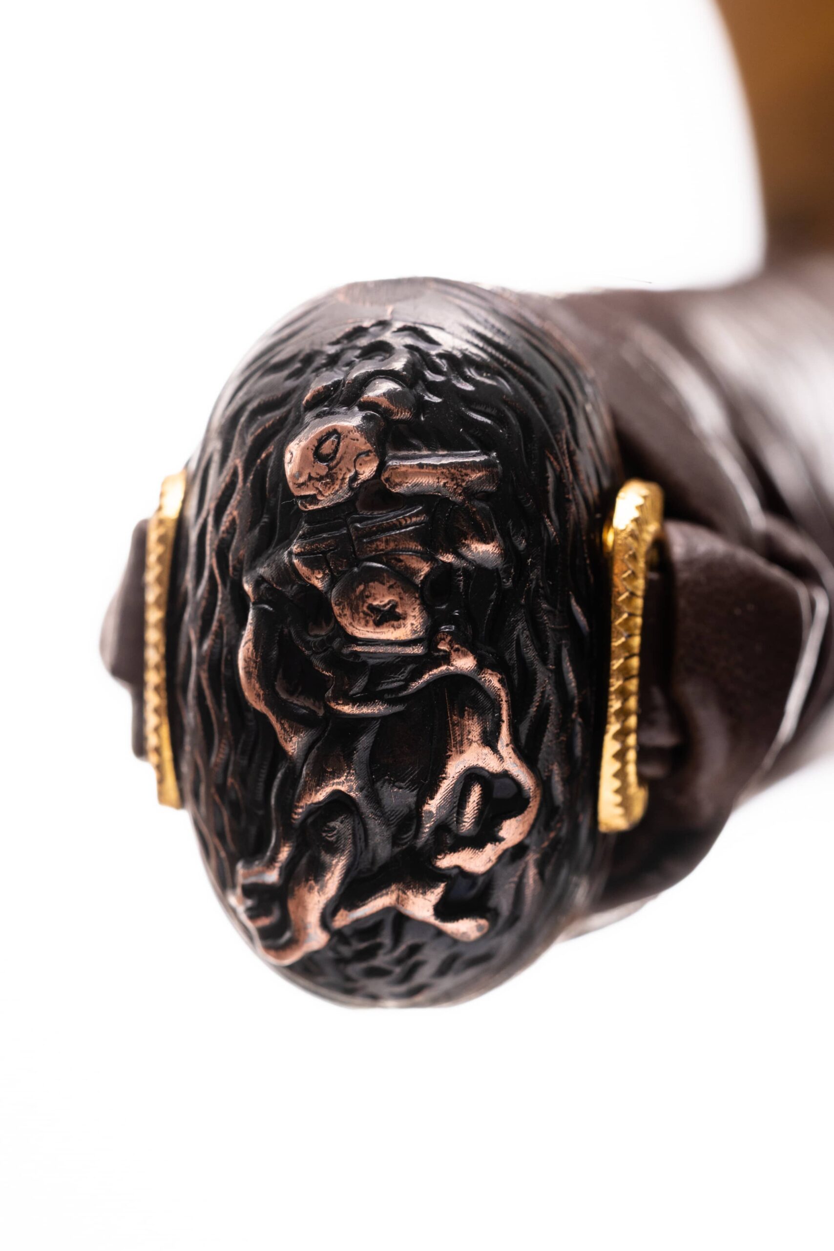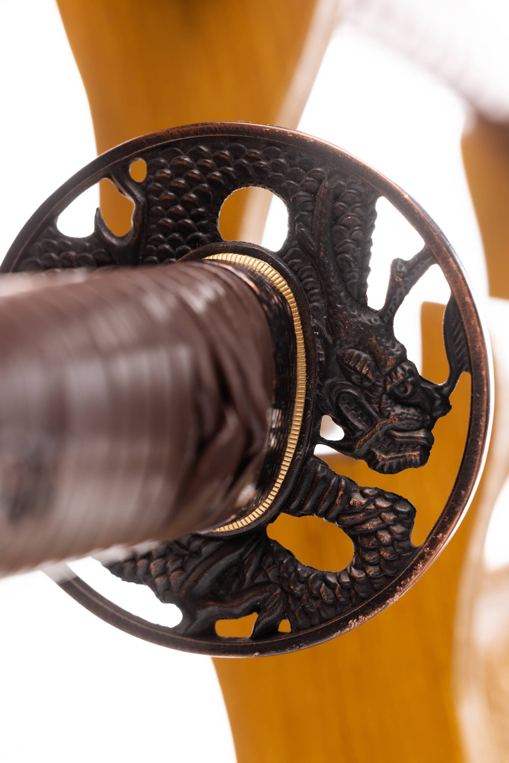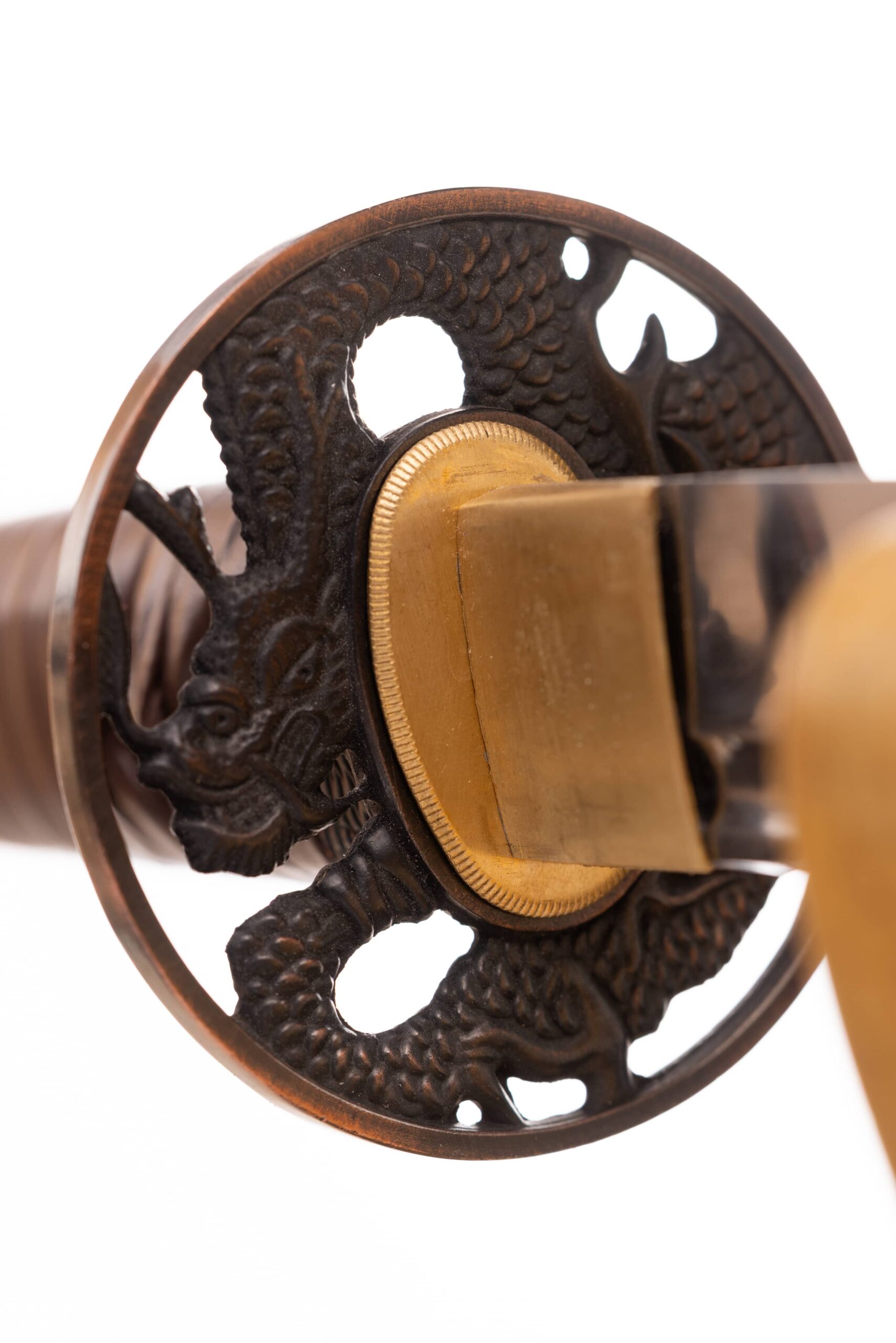 Habaki wykonane z mosiądzu. Podkładki seppa zrobione tego samego materiału. Tsuba ażurowa, miedziowana, okrągła, z motywem smoka. Fuchi, kashira i menuki miedziowane, z motywem strażników Nio. Pochwa (saya) bordowa, drewniana, karbowana z czarnymi wykończeniami. Sageo jedwabne, japońskie wielokolorowe (róż, biel, seledyn).