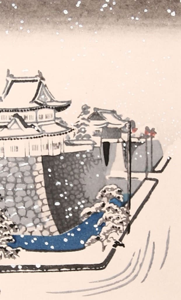 Barwny drzeworyt przedstawiający fragment japońskiej architektury obronnej w zimowej scenerii. Widoczny zamek lub rezydencja o charakterystycznych dachach, masywny kamienny mur oraz fosa z płynącą wodą.