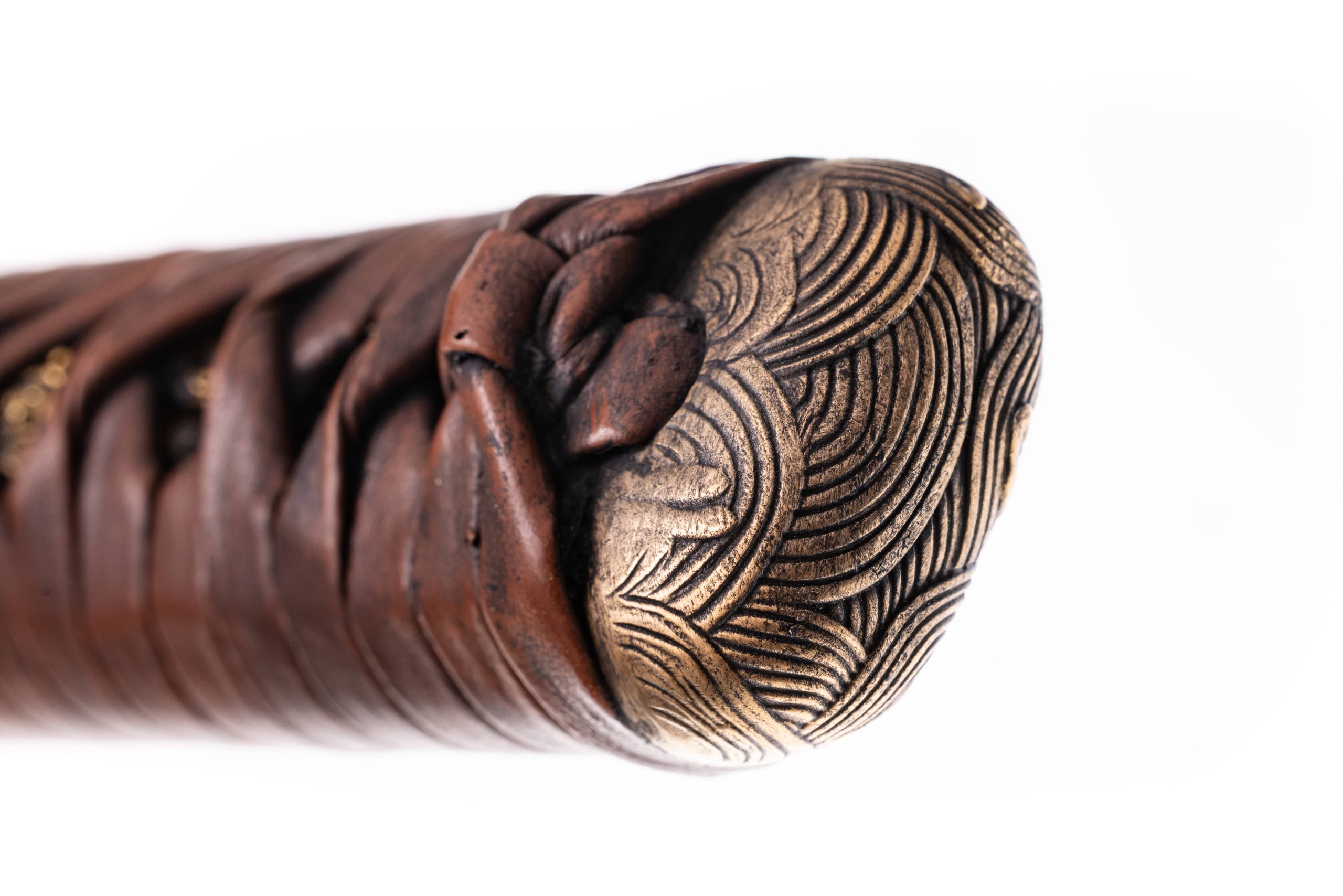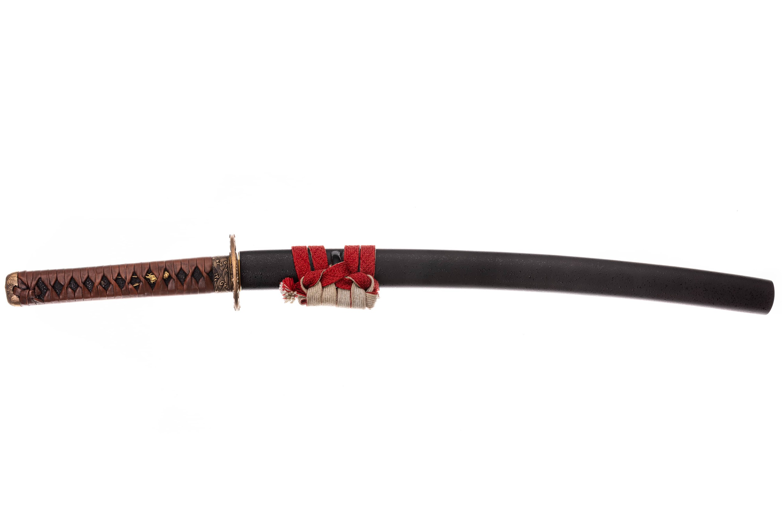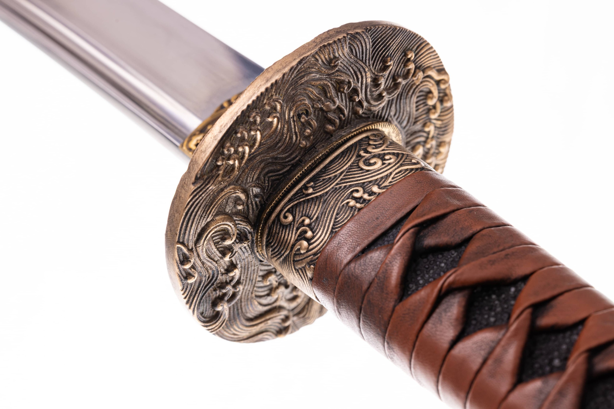 Rękojeść o długości 22 cm (tsuka) z tego samego drewna co pochwa obłożonego naturalną czarną same-gawa. Oplot o splocie typowym, wykonany z brązowej, skórzanej, antykizowanej taśmy ito. Miecz można całkowicie rozebrać na pojedyncze elementy w celu ich konserwacji lub wymiany.