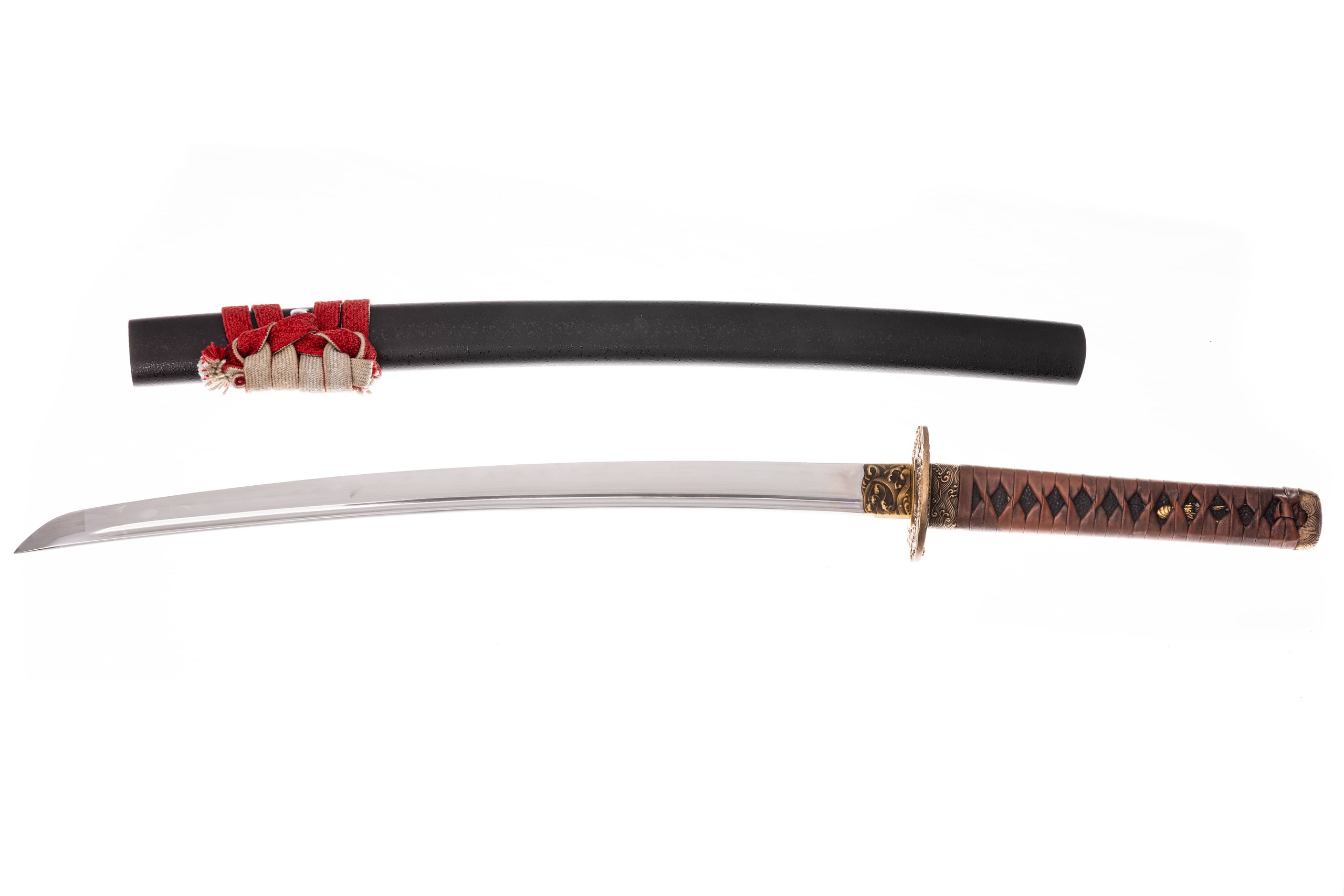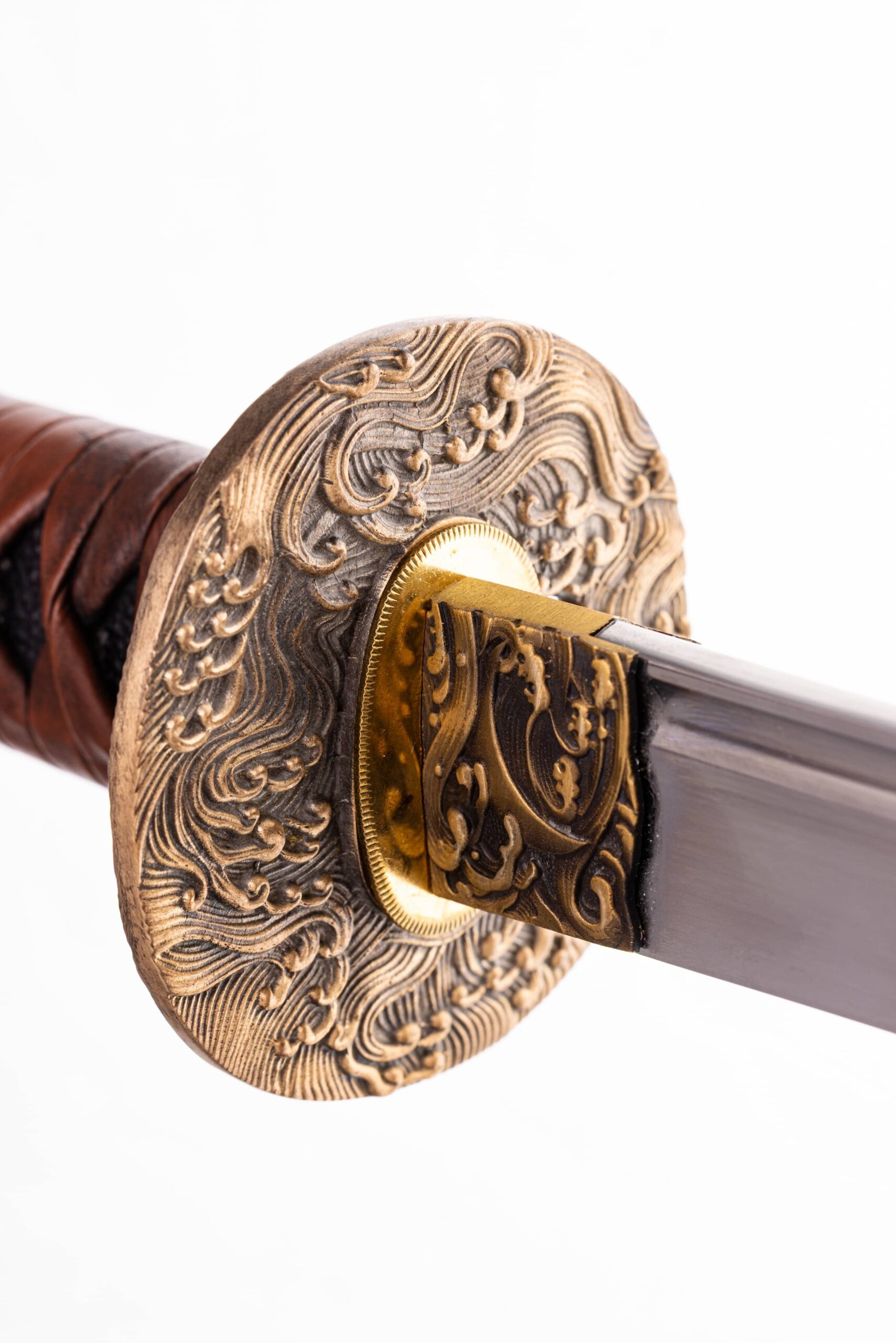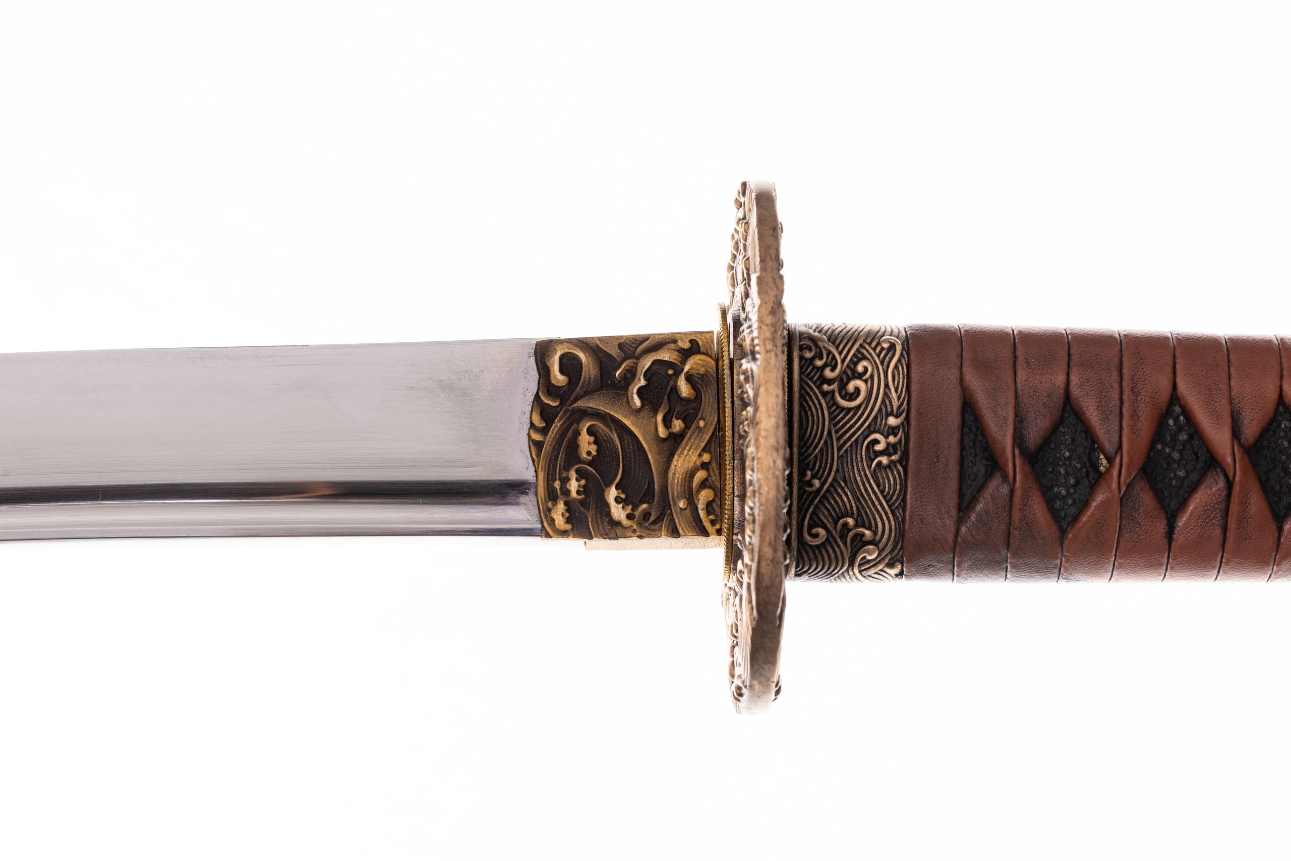 Habaki mosiężne, bogato rzeźbione, z motywem słońca i księżyca wśród fal morskich. Podkładki seppy z mosiądzu. Fuchi i kashira z tego samego materiału, z motywem fali morskich. Tsuba okrągła, mosiężna, pełna, z tym samym motywem co pozostałe okucia. Menuki japoński, mosiężne, z motywem krewetki. Pochwa (saya) drewniana, pokryta czarnym, matowym lakierem. Taśma sageo jedwabna, japońska, w kolorze szaro-różowym.