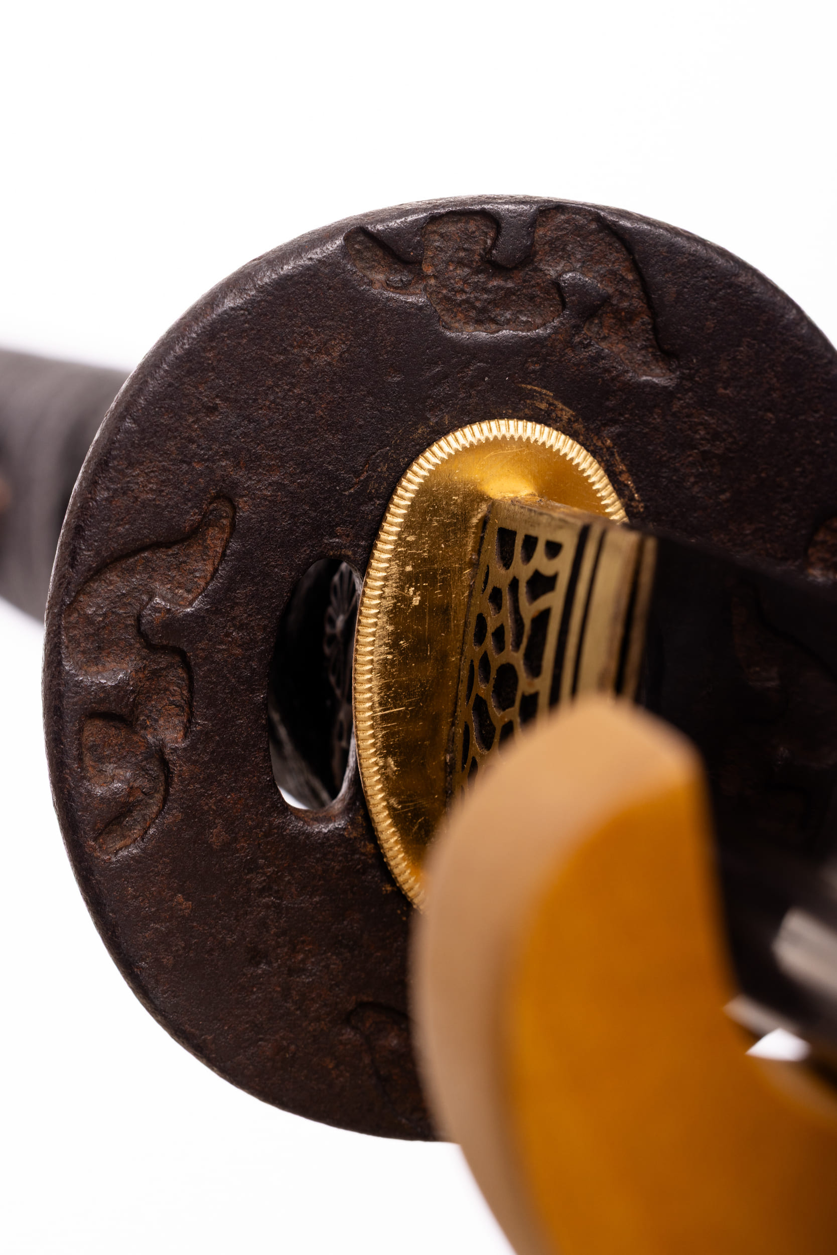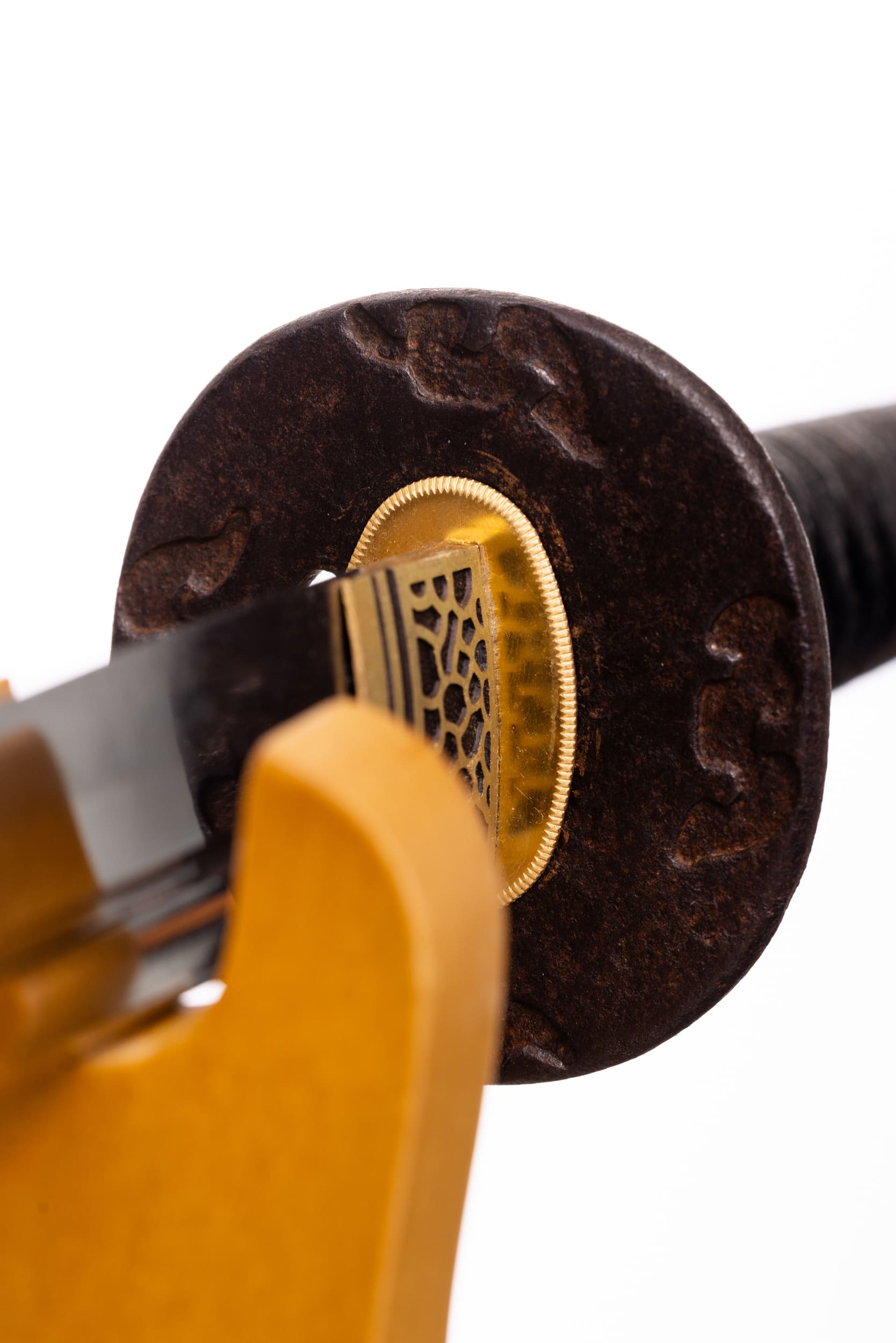 Habaki mosiężne zdobione komórkowym wzorem. Podkładki seppa z tego samego materiału. Tsuba pełna, owalna, z motywem meandru, kuta i hartowana, zabytek z okresu Edo. Fuchi, kashira miedziowane z motywem florystycznym. Menuki tradycyjnie z motywem smoka. Pochwa (saya) z drewna magnolii pokryta lśniącą czarną laką, ze wzmocnieniem pod lewą rękę kizani z polerowanej i zalakowanej skóry płaszczki oraz wykończeniem z rogu bawolego. Taśma sageo jedwabna, japońska, ręcznie tkana, fioletowo-szara.