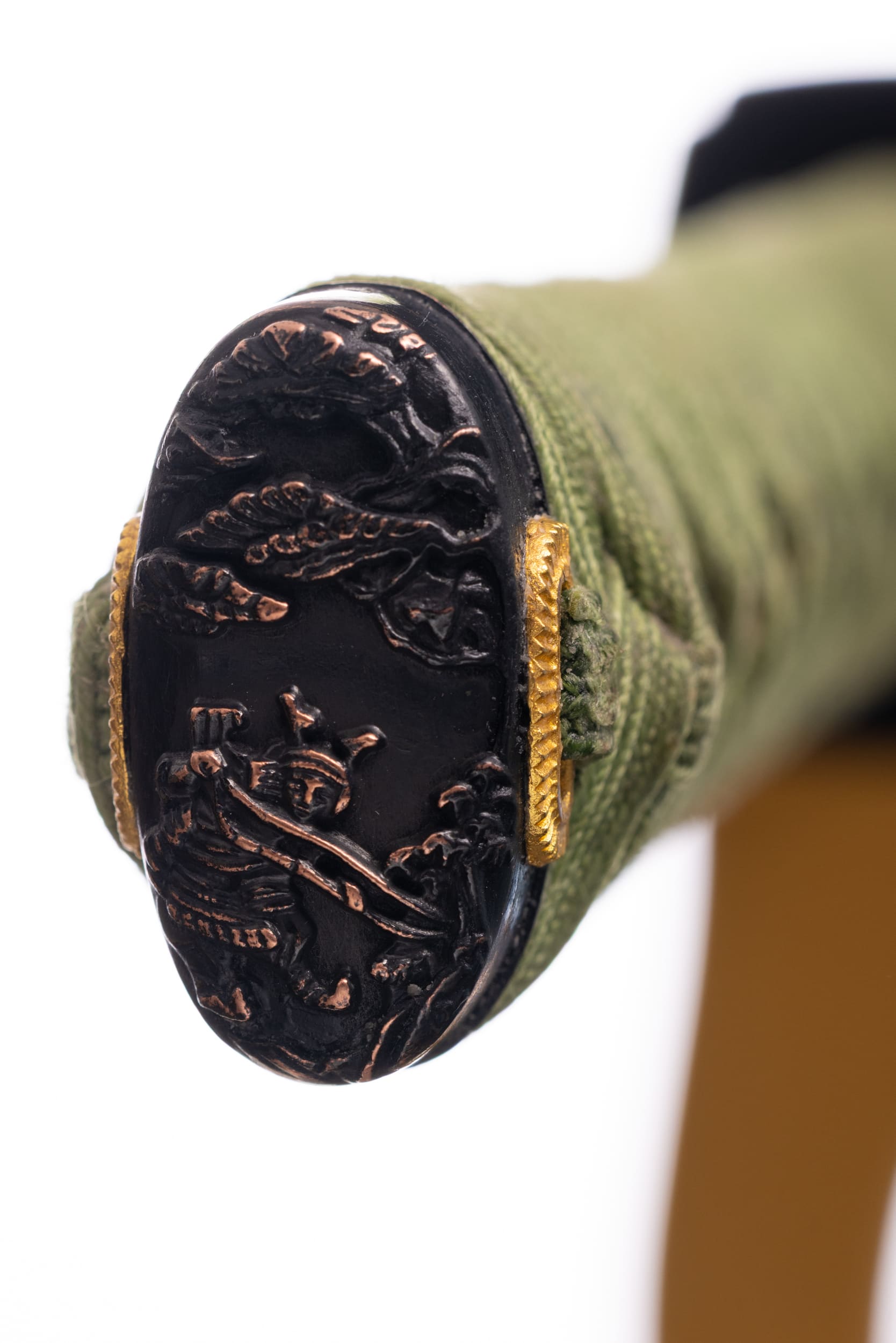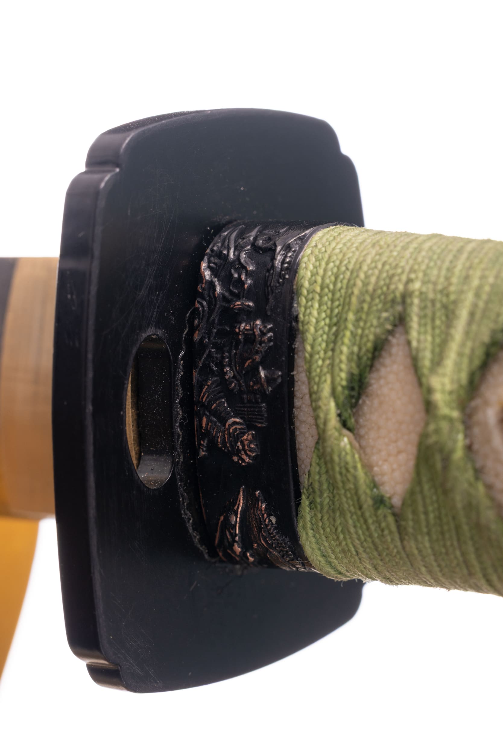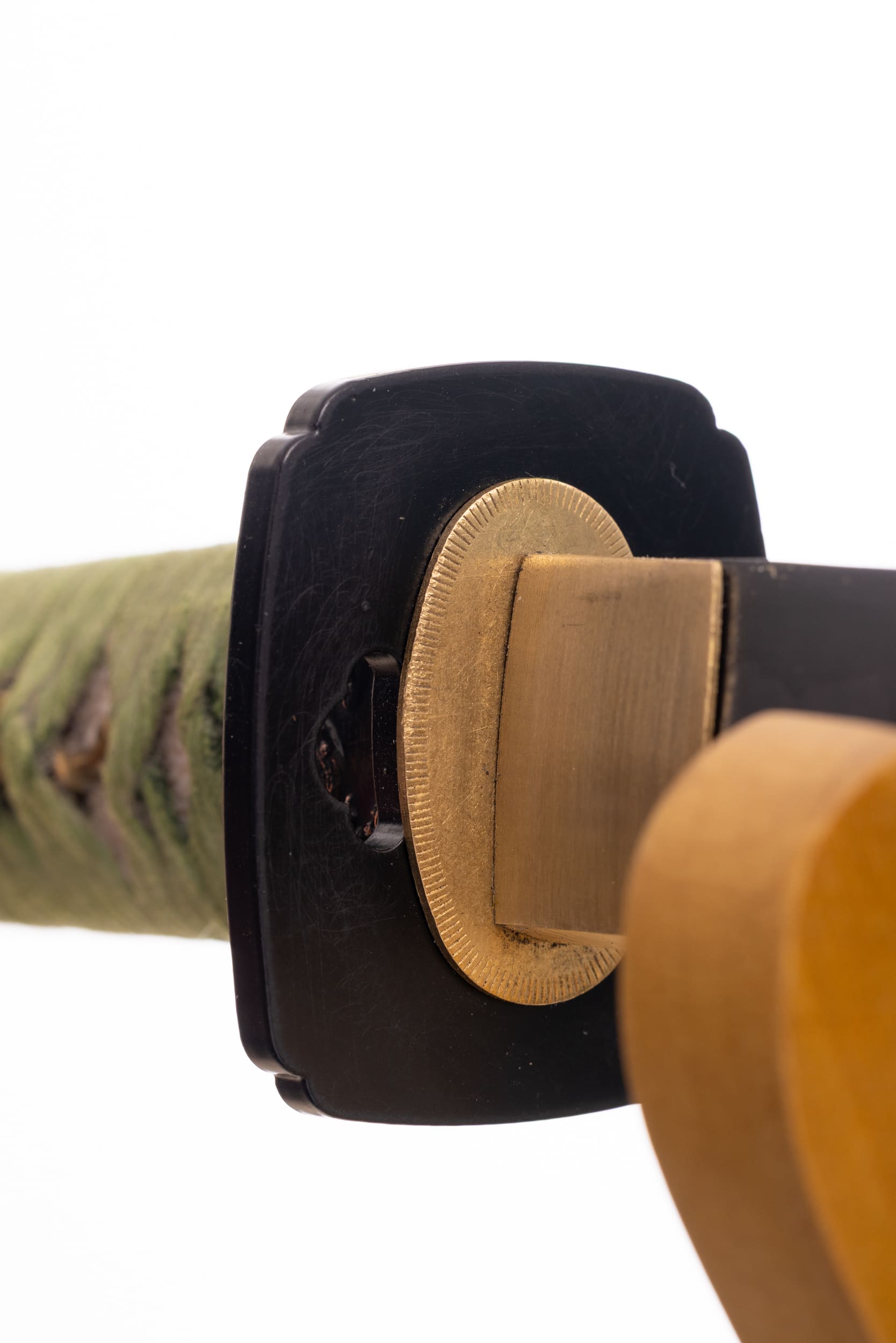 Habaki mosiężne. Podkładka seppa z mosiądzu. Tsuba żelazna, czarna, w kształcie mokko. Fuchi i kashira miedziowane z motywem z samurajskiej scenki rodzajowej. Pochwa (saya) z drewna magnolii w całości pokryta lakowaną na zielono i polerowaną skórą płaszczki. Wykończenia saya jasne, rogowe. Sageo jedwabne, japońskie z przejściem tonalnym od jasnozielonego do pomarańczowego.