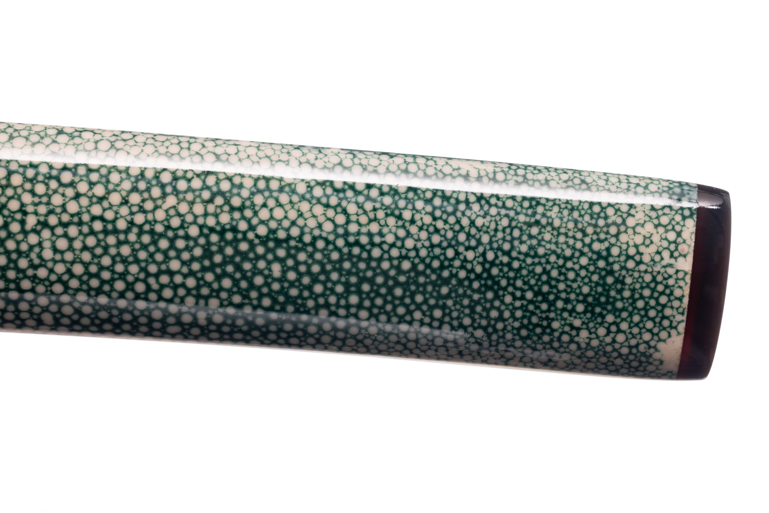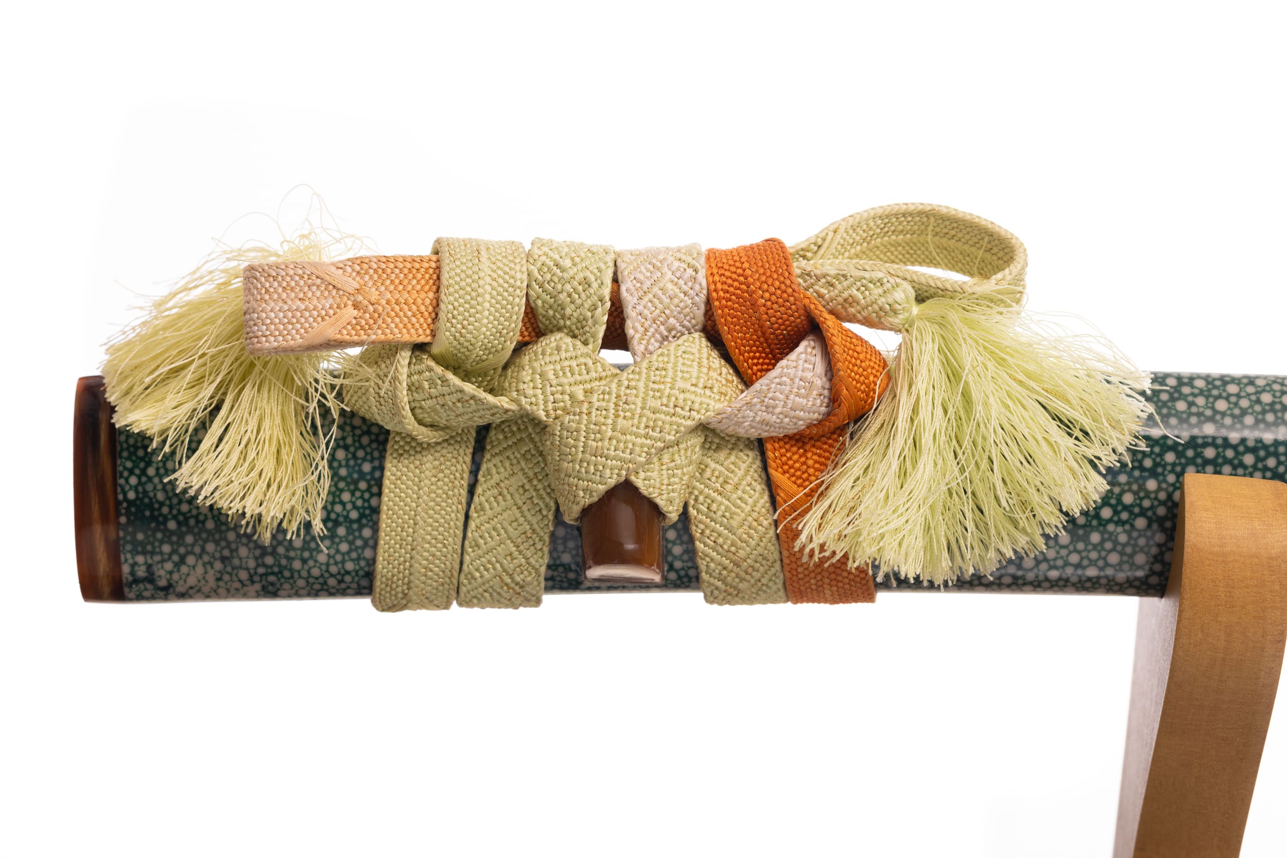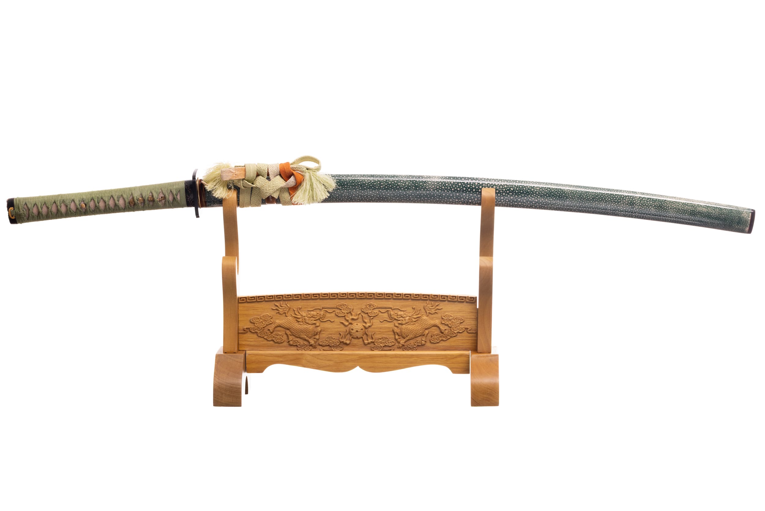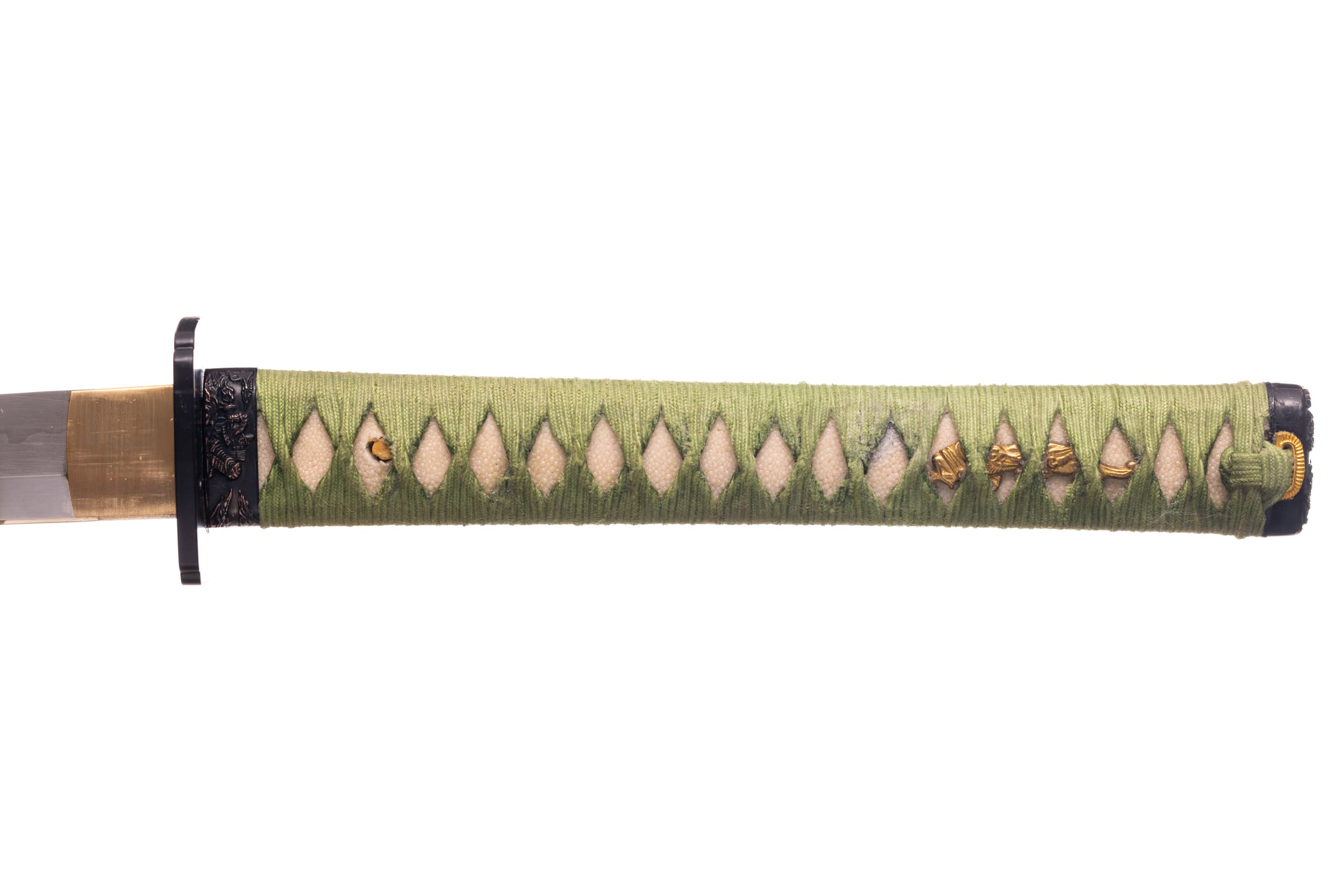 Habaki mosiężne. Podkładka seppa z mosiądzu. Tsuba żelazna, czarna, w kształcie mokko. Fuchi i kashira miedziowane z motywem z samurajskiej scenki rodzajowej. Pochwa (saya) z drewna magnolii w całości pokryta lakowaną na zielono i polerowaną skórą płaszczki. Wykończenia saya jasne, rogowe. Sageo jedwabne, japońskie z przejściem tonalnym od jasnozielonego do pomarańczowego.