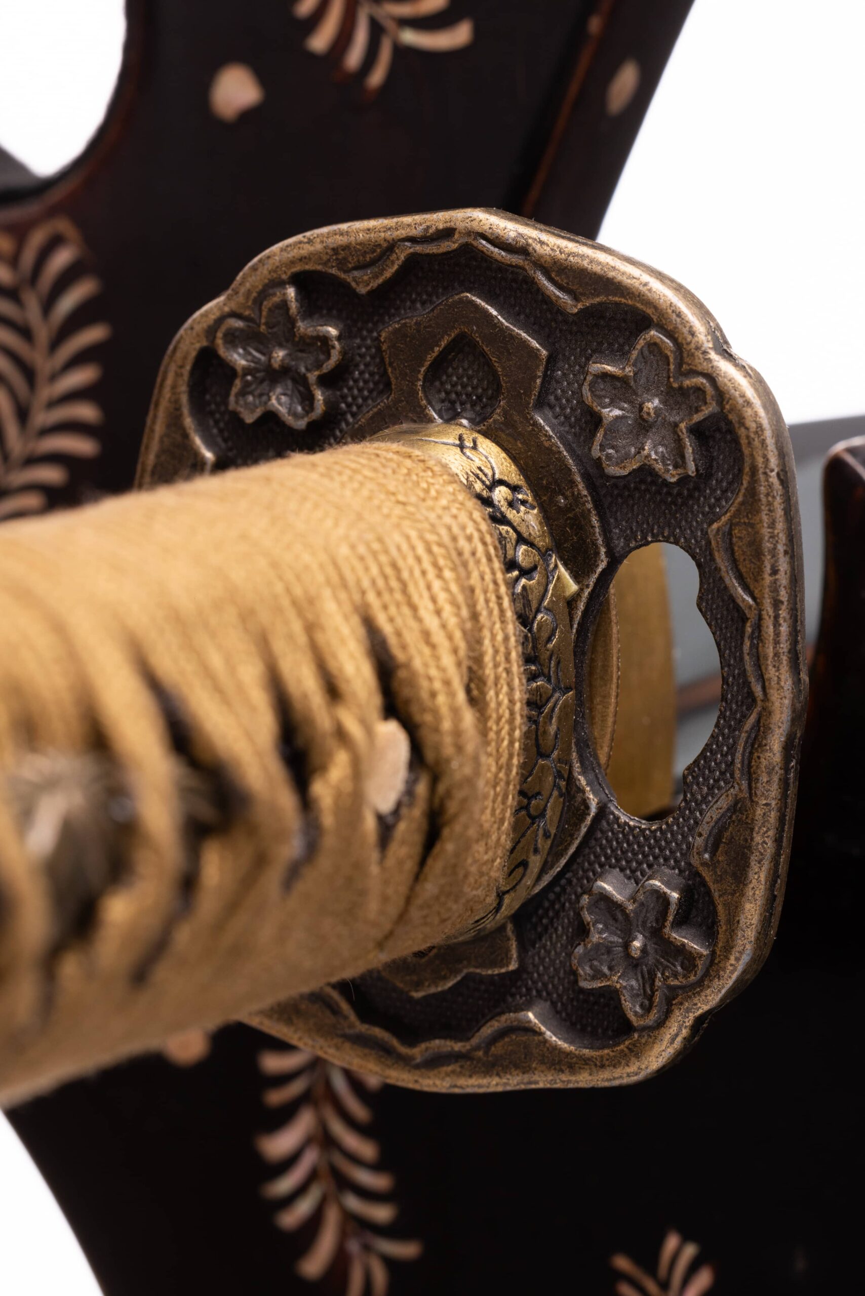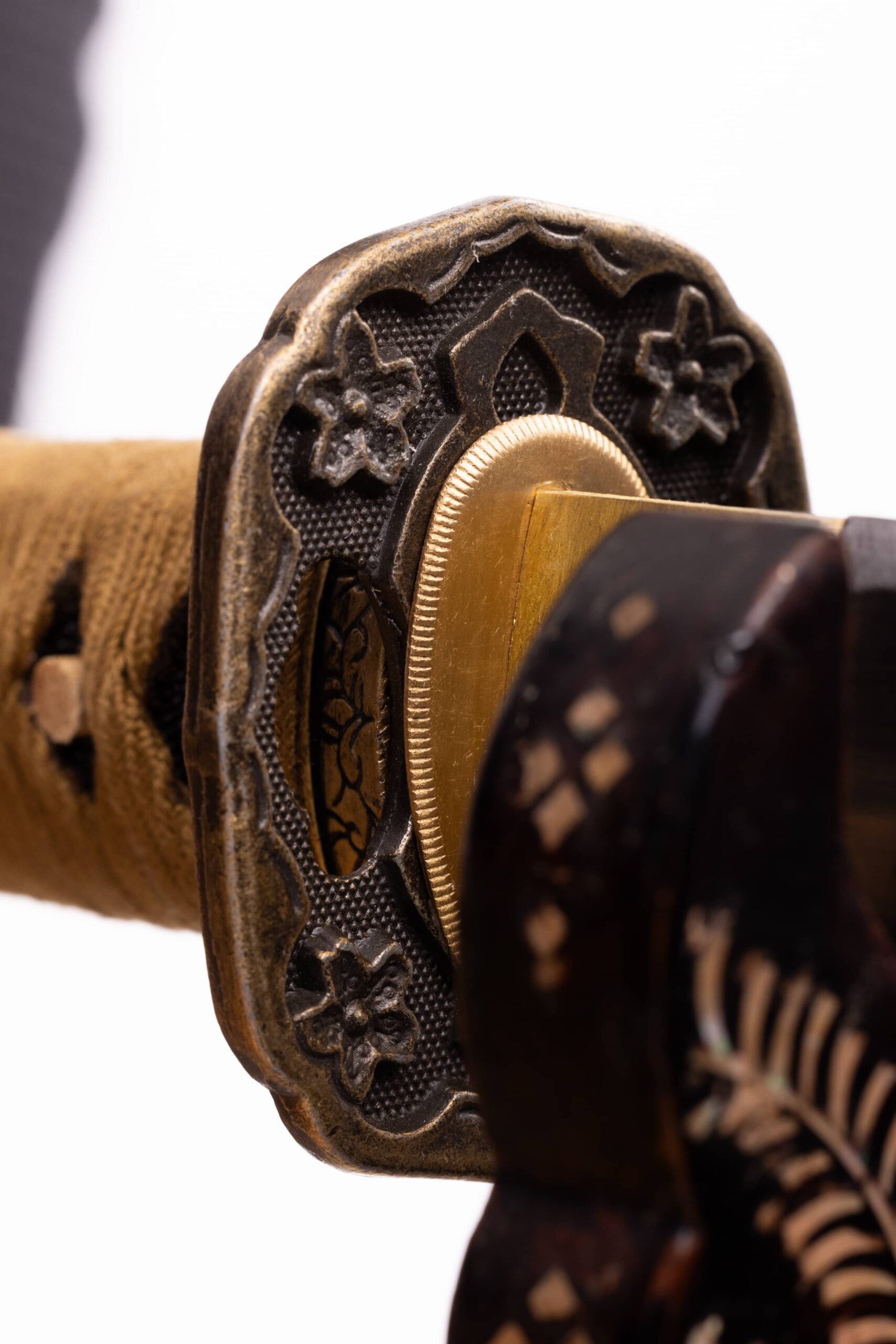Habaki wykonane z mosiądzu, podobnie jak seppy. Tsuba mosiężna, z motywem kwiatów wiśni, w typie mokko, nawiązująca do tsub mieczy gunto. Fuchi i kashira mosiężne, z motywem wici roślinnej. Menuki mosiężne, z motywem liści bambusa. Pochwa (saya), drewniana, pokryta bezbarwnym lakierem. Sageo jedwabne, japońskie, złoto zielone, o ozdobnym splocie.