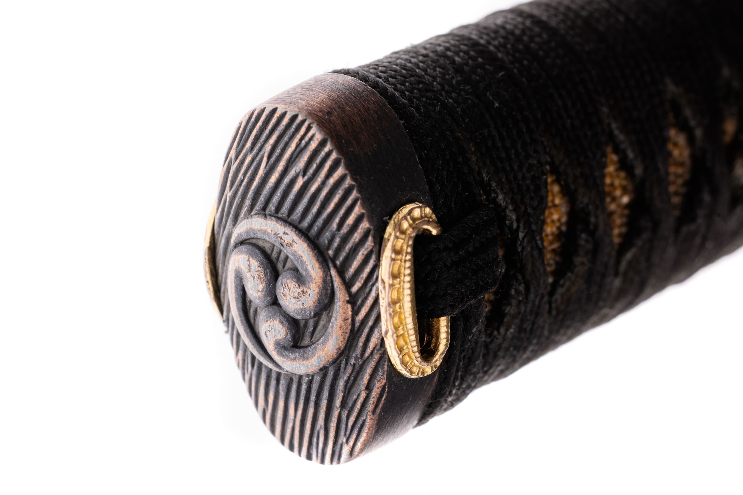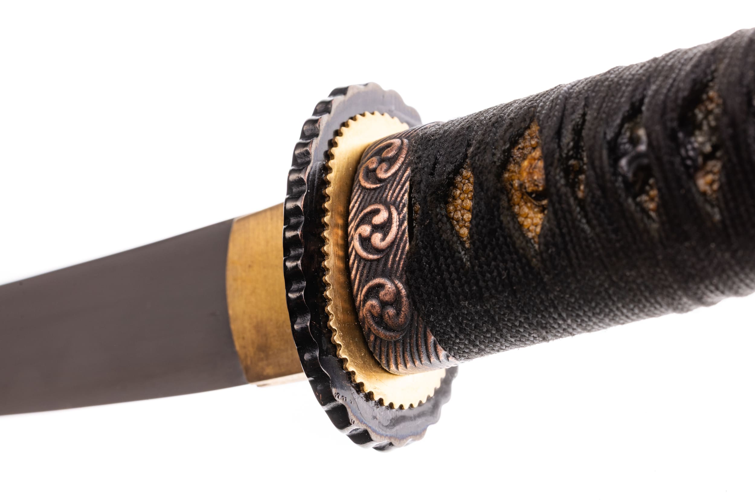 Rękojeść długości 13,5 cm (tsuka) obłożona patynowaną naturalną same-gawa. Pochwa z tego samego drewna. Oplot wykonany z czarnej, bawełnianej, taśmy ito o typowym splocie. Miecz można całkowicie rozebrać na pojedyncze elementy w celu ich konserwacji lub wymiany.
