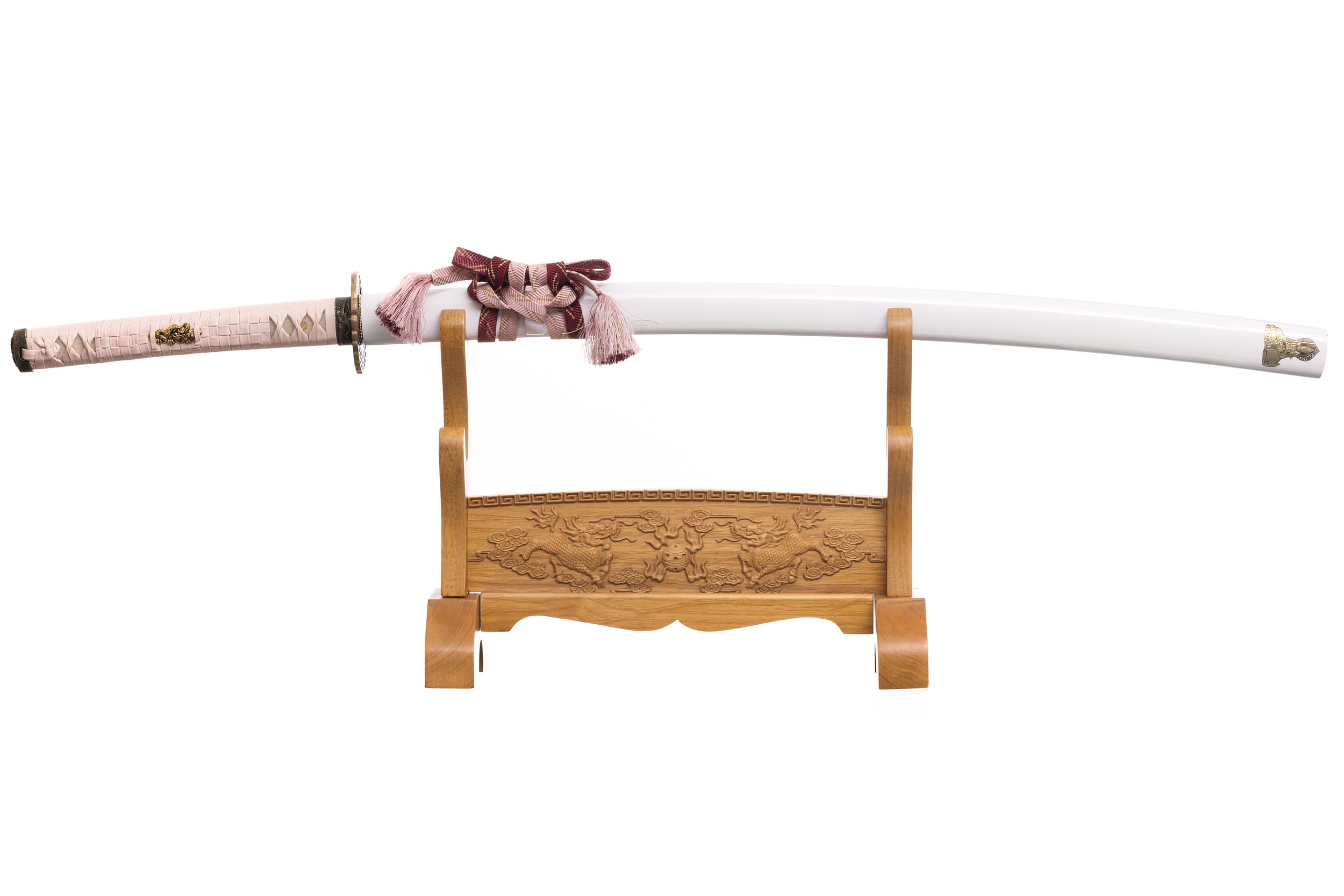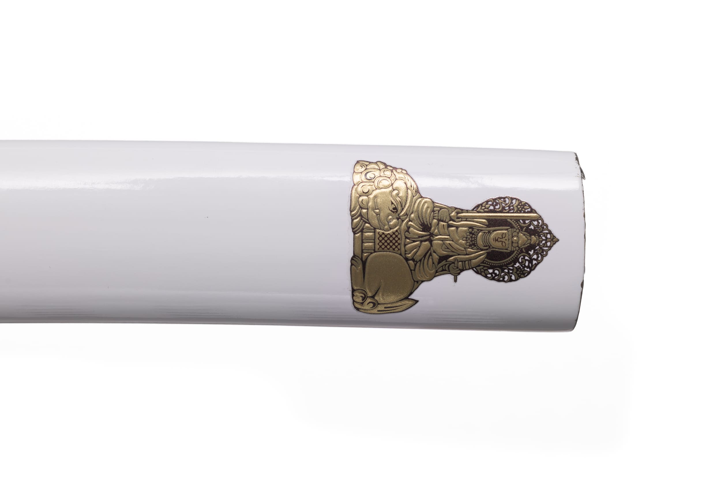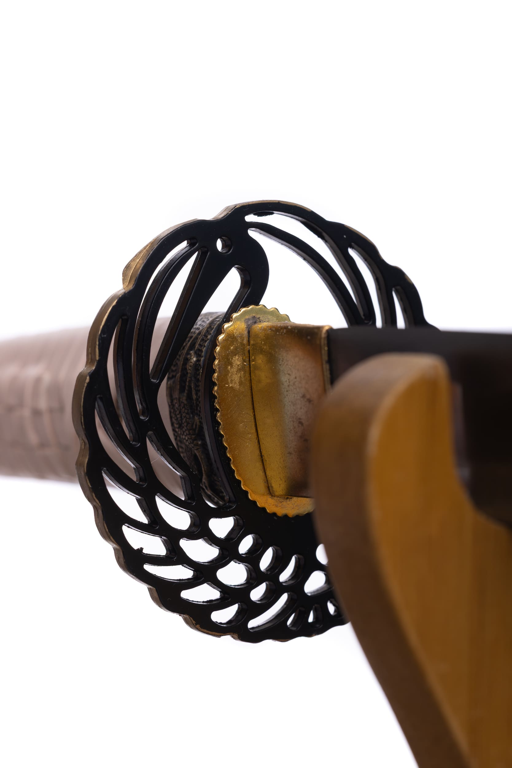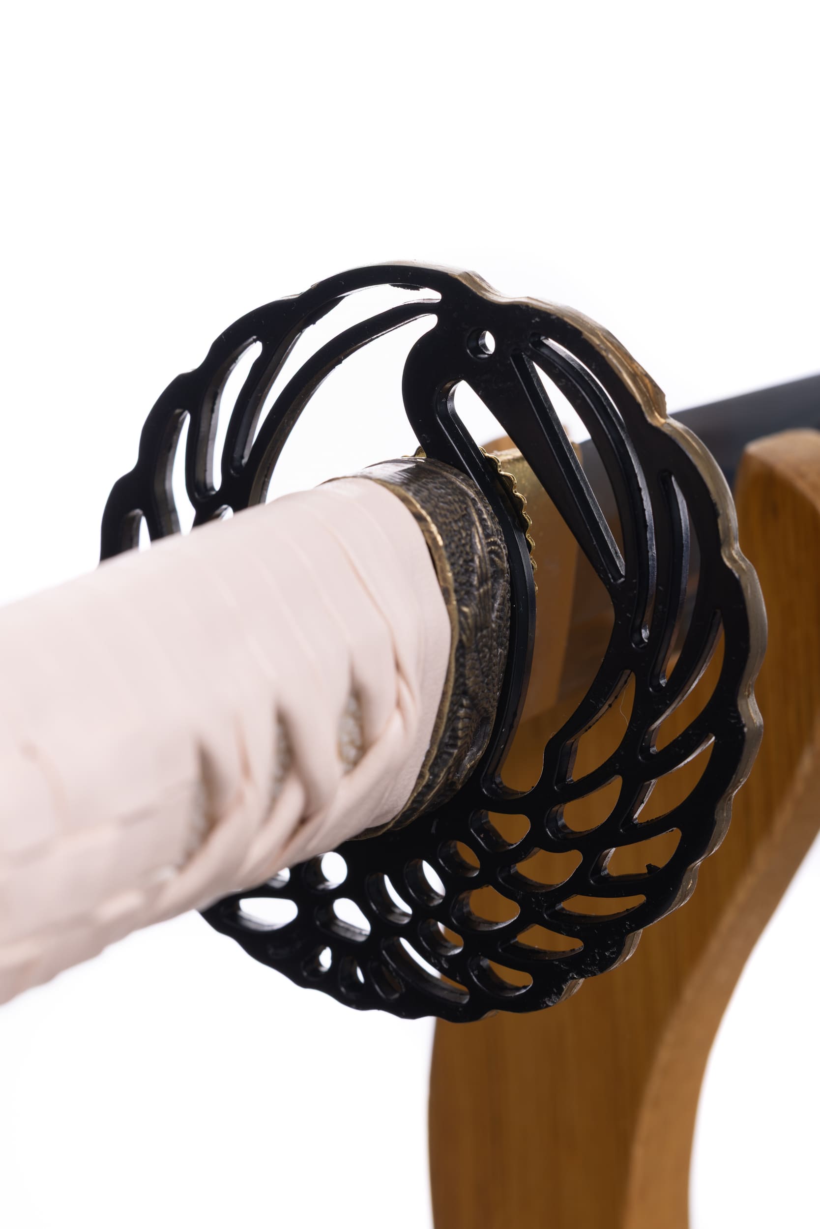 Habaki mosiężne bez zdobień. Podkładki seppa z tego samego materiału. Tsuba ażurowa, w typie sukkashi, czarna ze złotym rantem, stalowa, z motywem tańczącego żurawi (tsuru maru). Fuchi, kashira z mosiądzu z tym samym motywem, menuki motywem smoka również mosiężne. Pochwa (saya) z drewna magnolii pokryta białą  laką, z ozdobnym zdobieniem przy końcu z motywem buddy. Sageo różowo- fioletowe, jedwabne, japońskie.