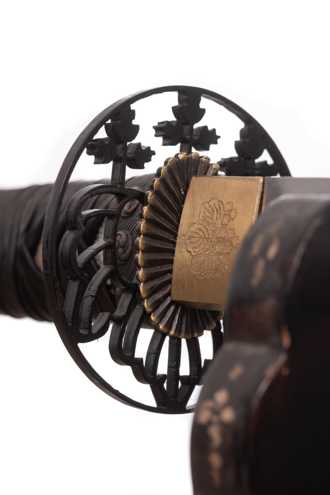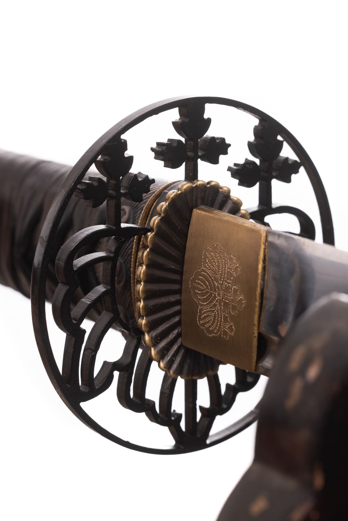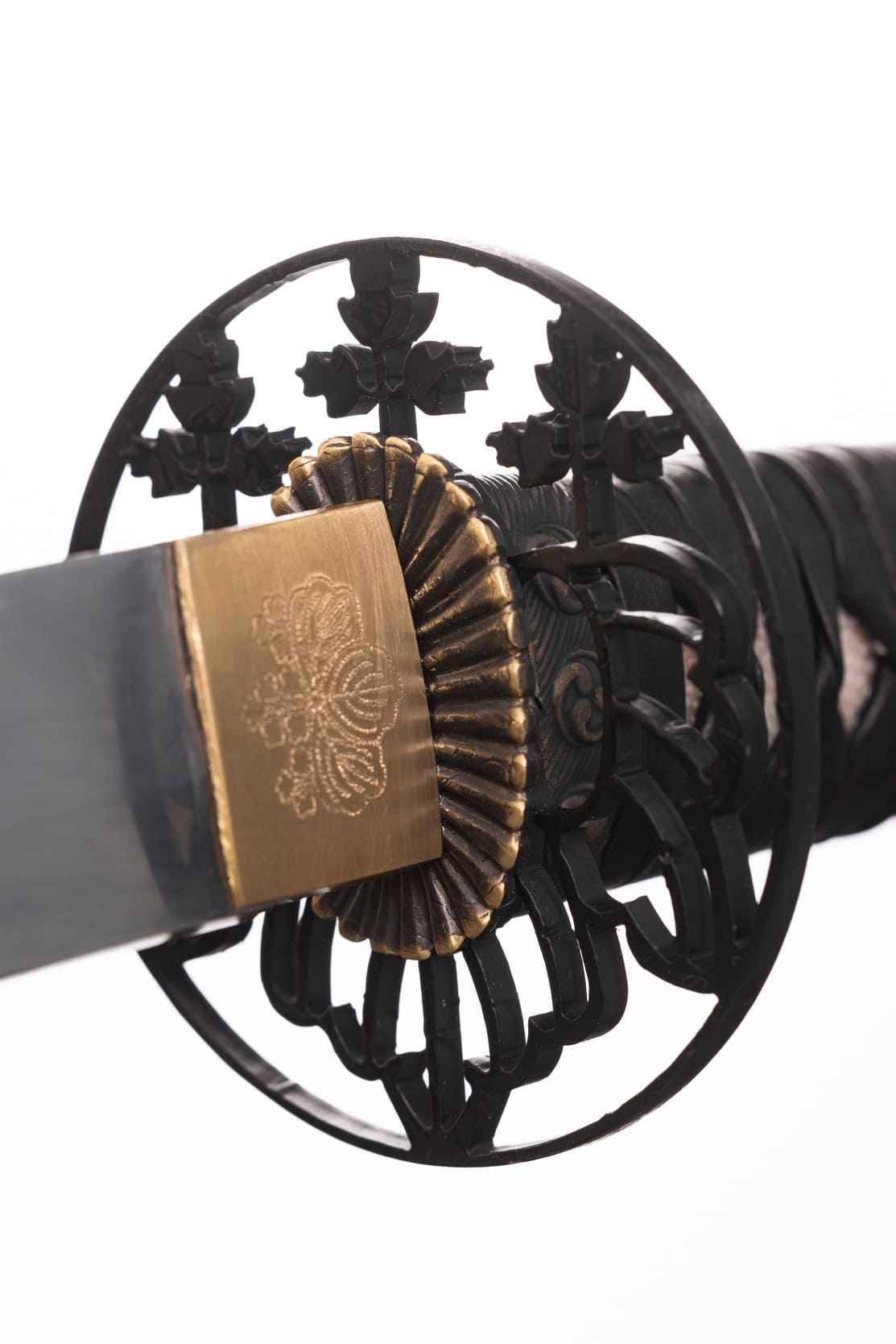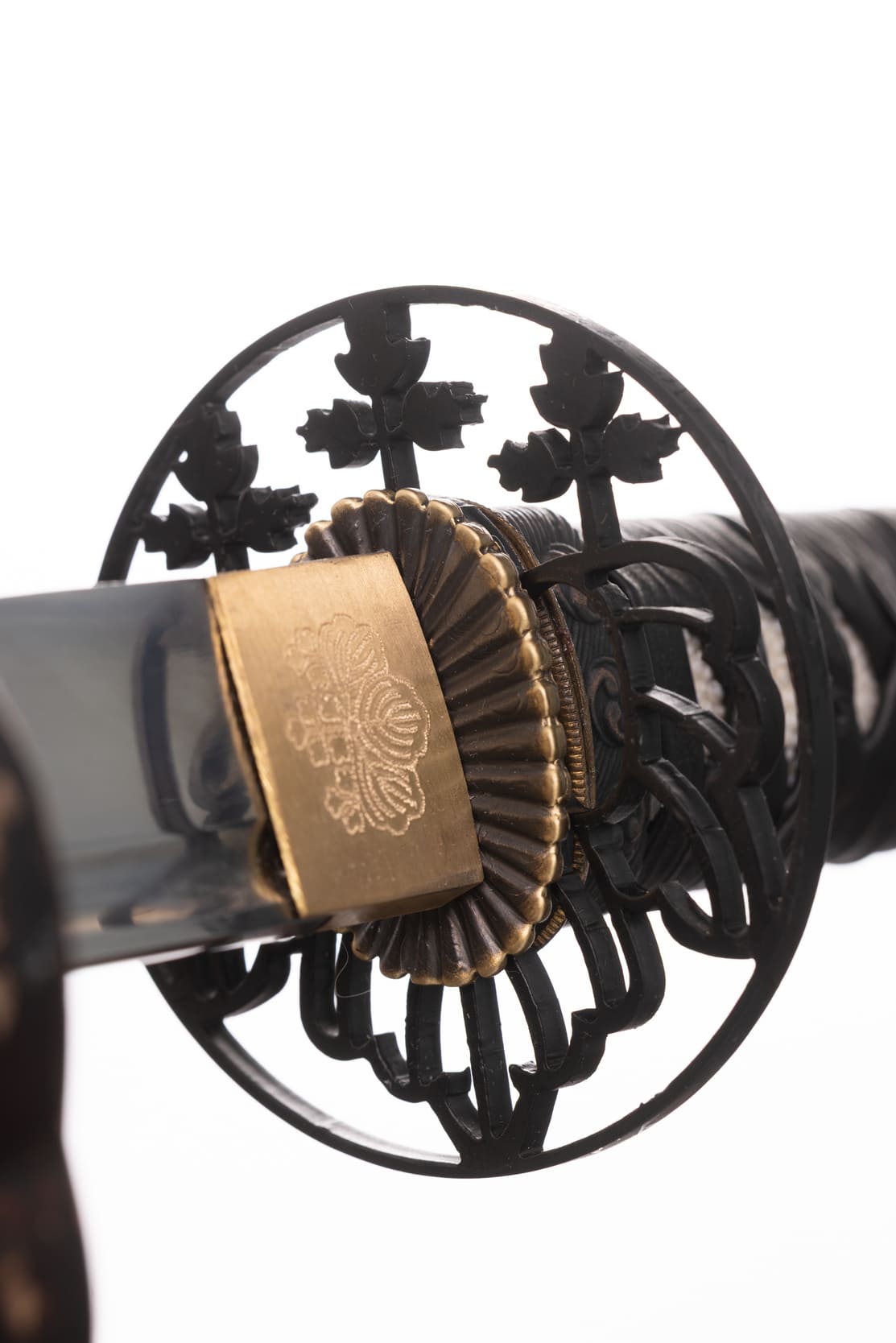 Habaki wykonane z mosiądzu. Podkładki seppa zrobione z mosiądzu w formie rozety. Tsuba ażurowa, stalowa, w typie sukkashi, z motywem kirimonu. Fuchi, kashira, miedziowane z motywem monu hajimana. Menuki miedziowane z motywem strażników świątyni Nio. Pochwa (saya) z drewna magnolii pokryta lśniącą czarną laką z złotym kirimonem przy końcu. Sageo czarnego koloru, z bawełny z domieszką poliestru.