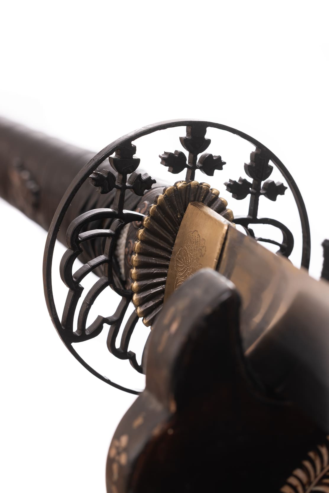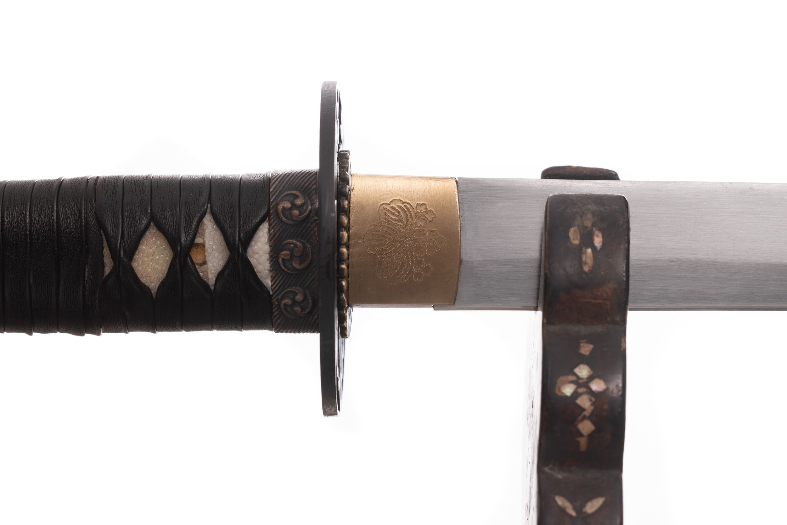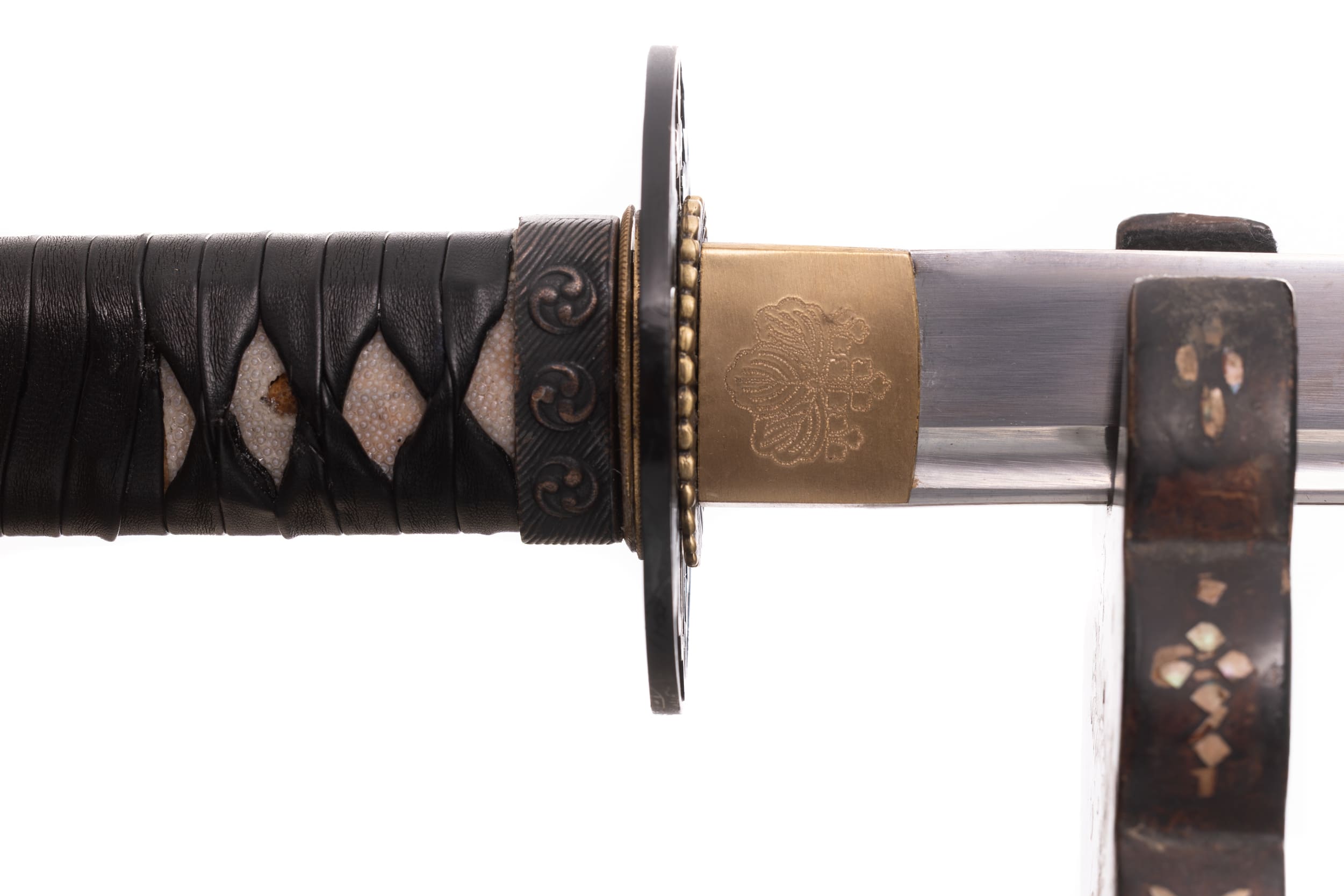 Habaki wykonane z mosiądzu. Podkładki seppa zrobione z mosiądzu w formie rozety. Tsuba ażurowa, stalowa, w typie sukkashi, z motywem kirimonu. Fuchi, kashira, miedziowane z motywem monu hajimana. Menuki miedziowane z motywem strażników świątyni Nio. Pochwa (saya) z drewna magnolii pokryta lśniącą czarną laką z złotym kirimonem przy końcu. Sageo czarnego koloru, z bawełny z domieszką poliestru.