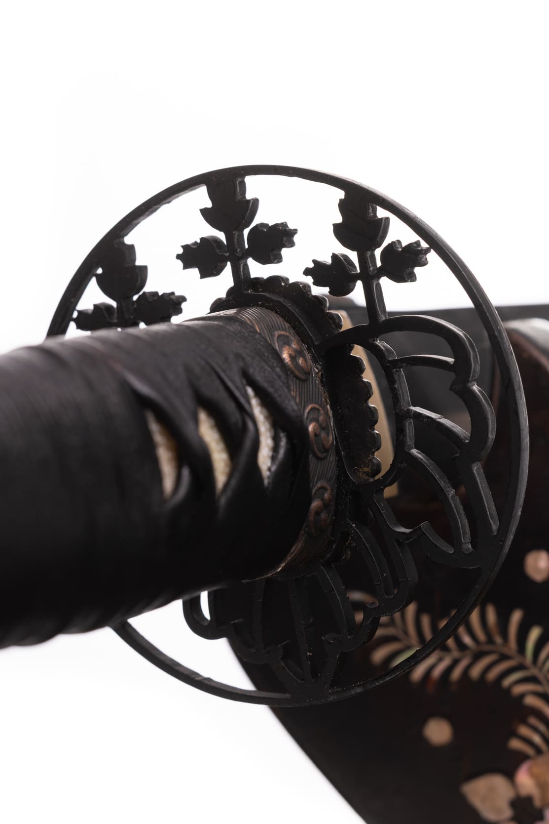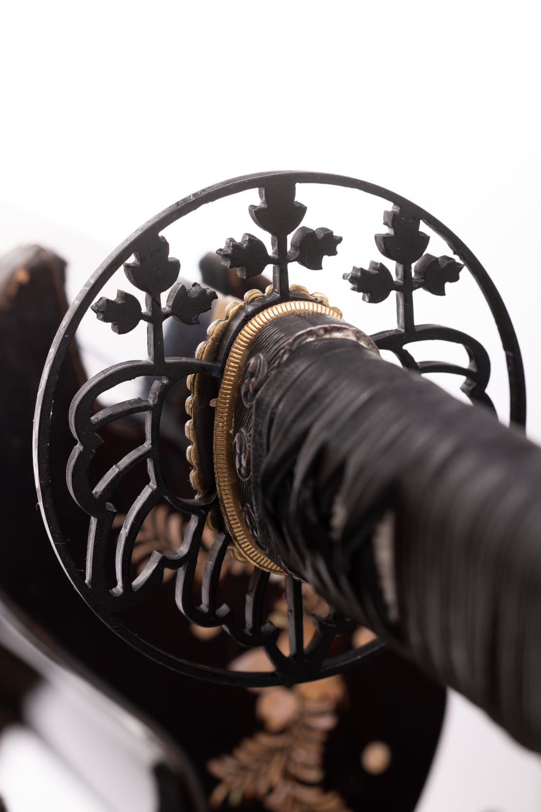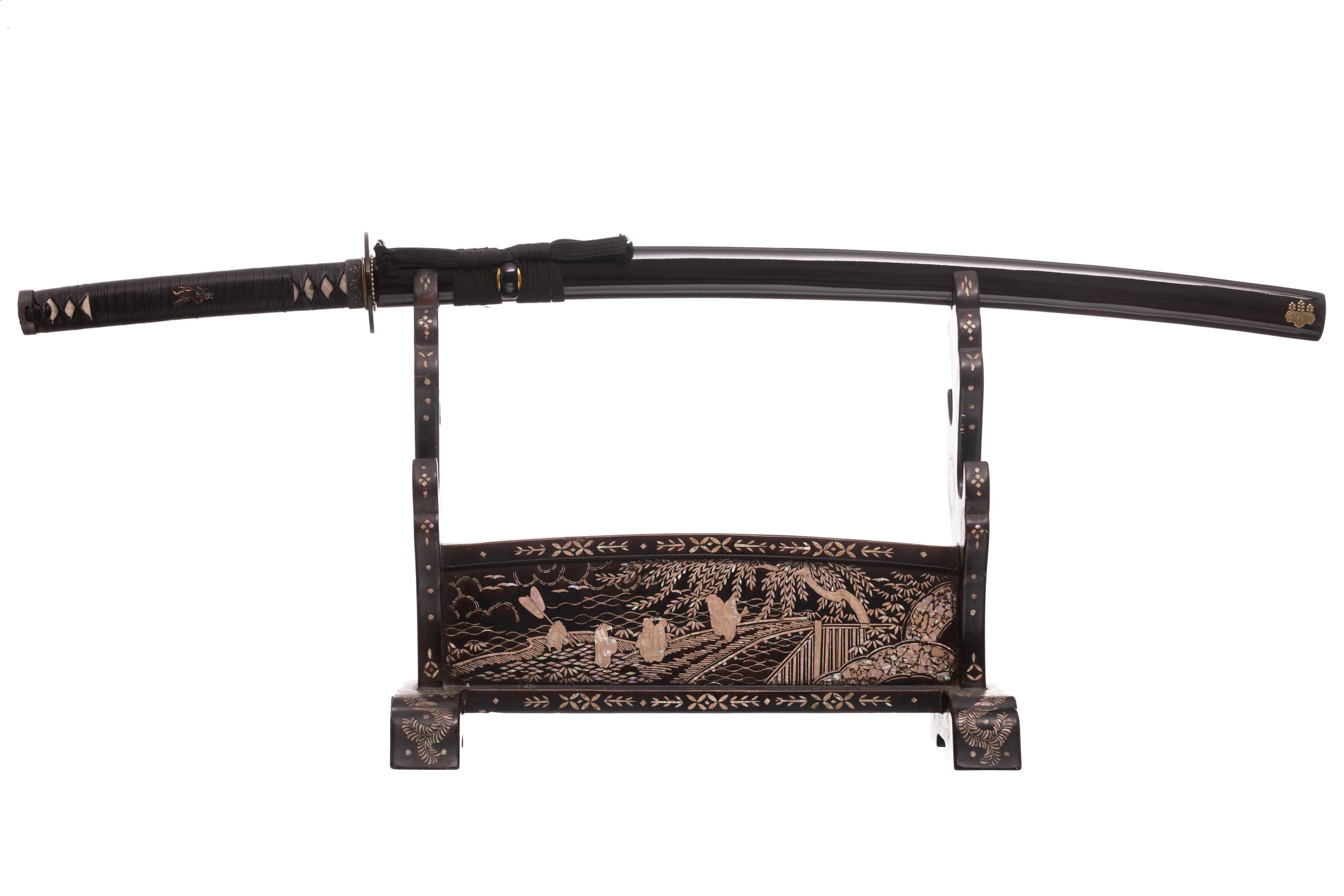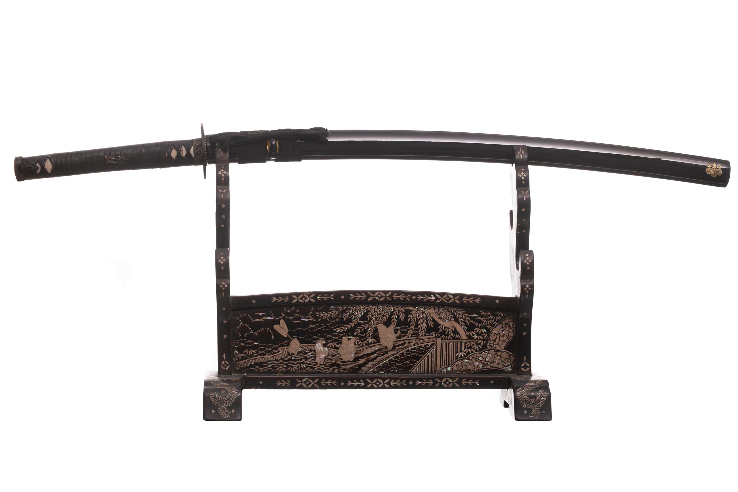 Habaki wykonane z mosiądzu. Podkładki seppa zrobione z mosiądzu w formie rozety. Tsuba ażurowa, stalowa, w typie sukkashi, z motywem kirimonu. Fuchi, kashira, miedziowane z motywem monu hajimana. Menuki miedziowane z motywem strażników świątyni Nio. Pochwa (saya) z drewna magnolii pokryta lśniącą czarną laką z złotym kirimonem przy końcu. Sageo czarnego koloru, z bawełny z domieszką poliestru.