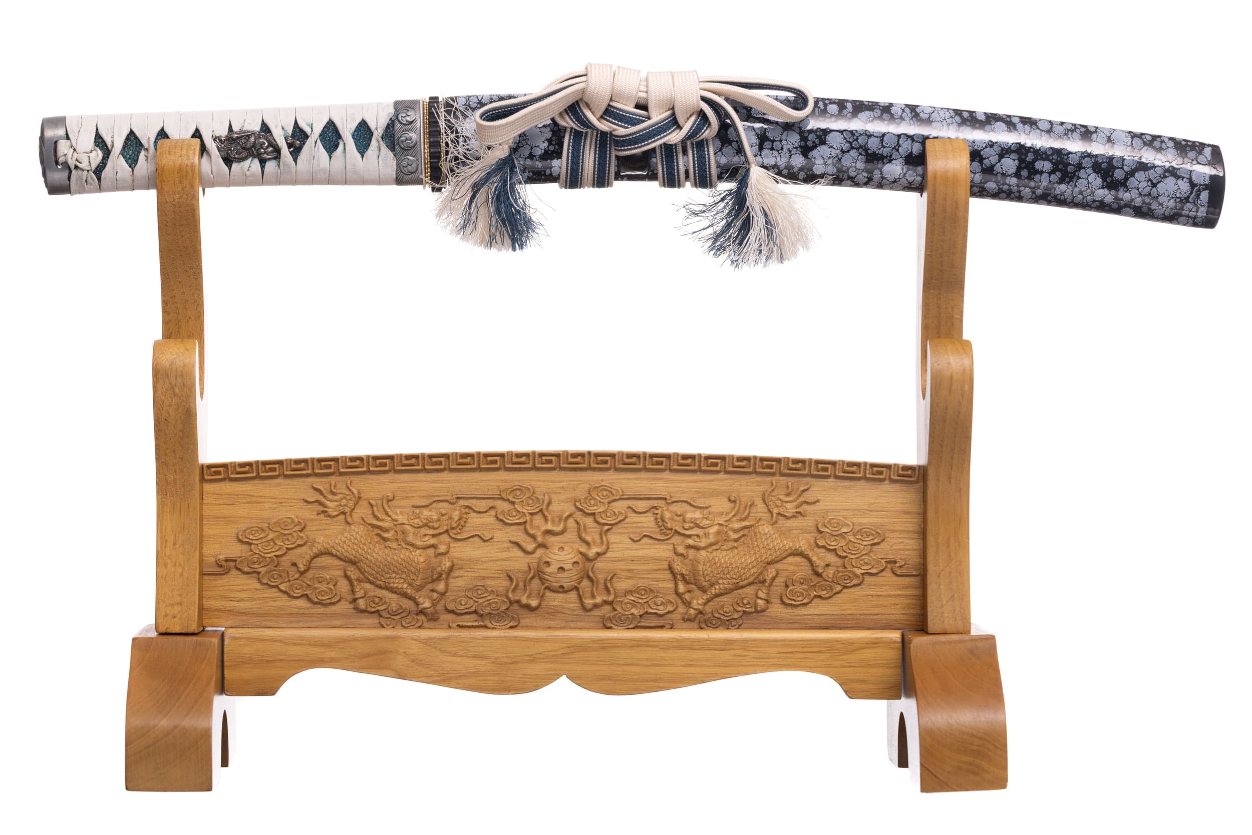 Habaki srebrne podobnie jak podkładki (seppa), bez zdobień. Tsuba żelazna, pełna, minimalistyczna, czarna w formie rozetki. Fuchi i kashira srebrne z motywem monu boga wojny hajimana. Menuki srebrne z motywem smoka. Pochwa (saya) tego tanto jest drewniana, pokryta lśniącą niebiesko-białym lakierem z abstrakcyjnym białym wzorem. Sageo japońskie biało-niebieskie, z jedwabiu.