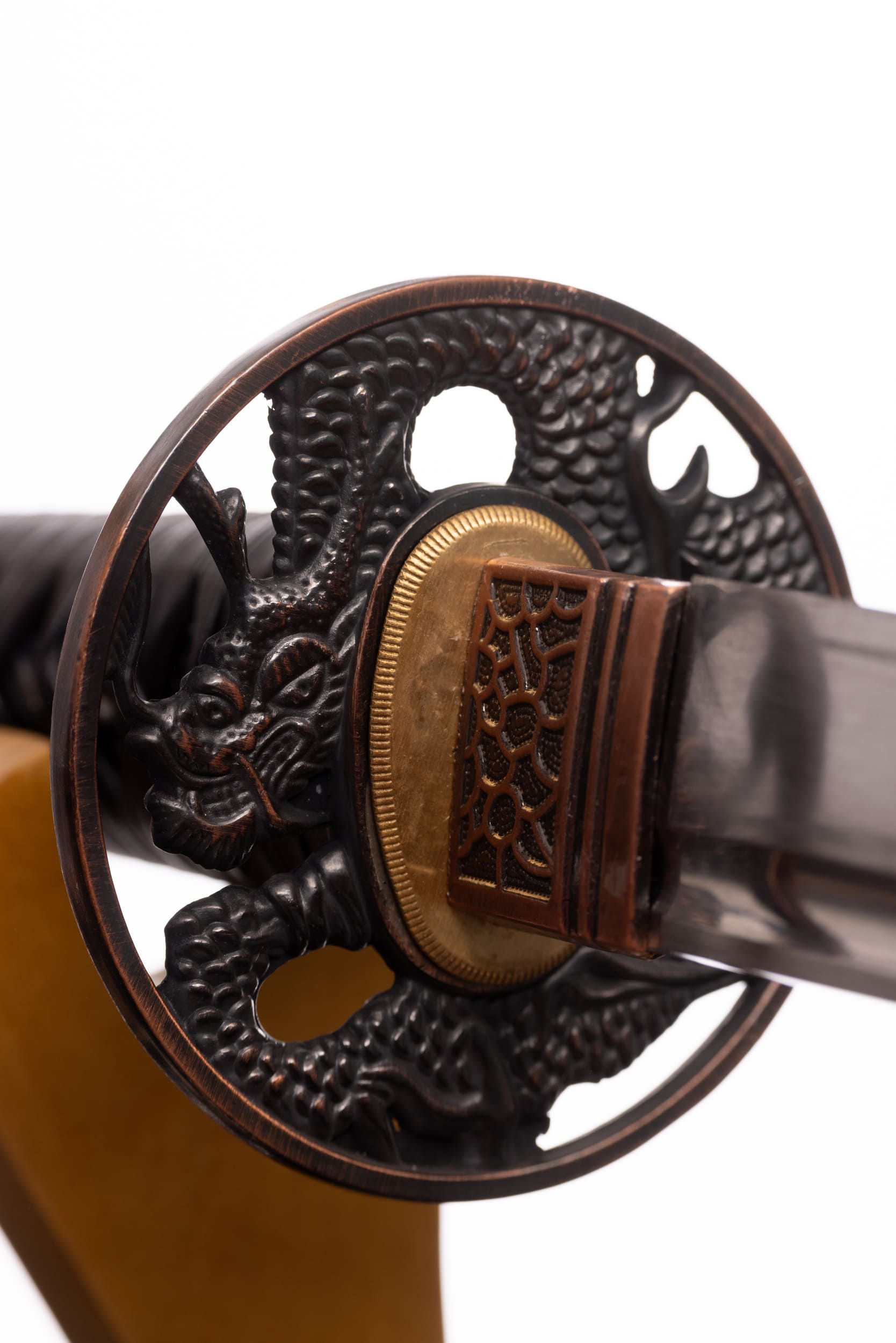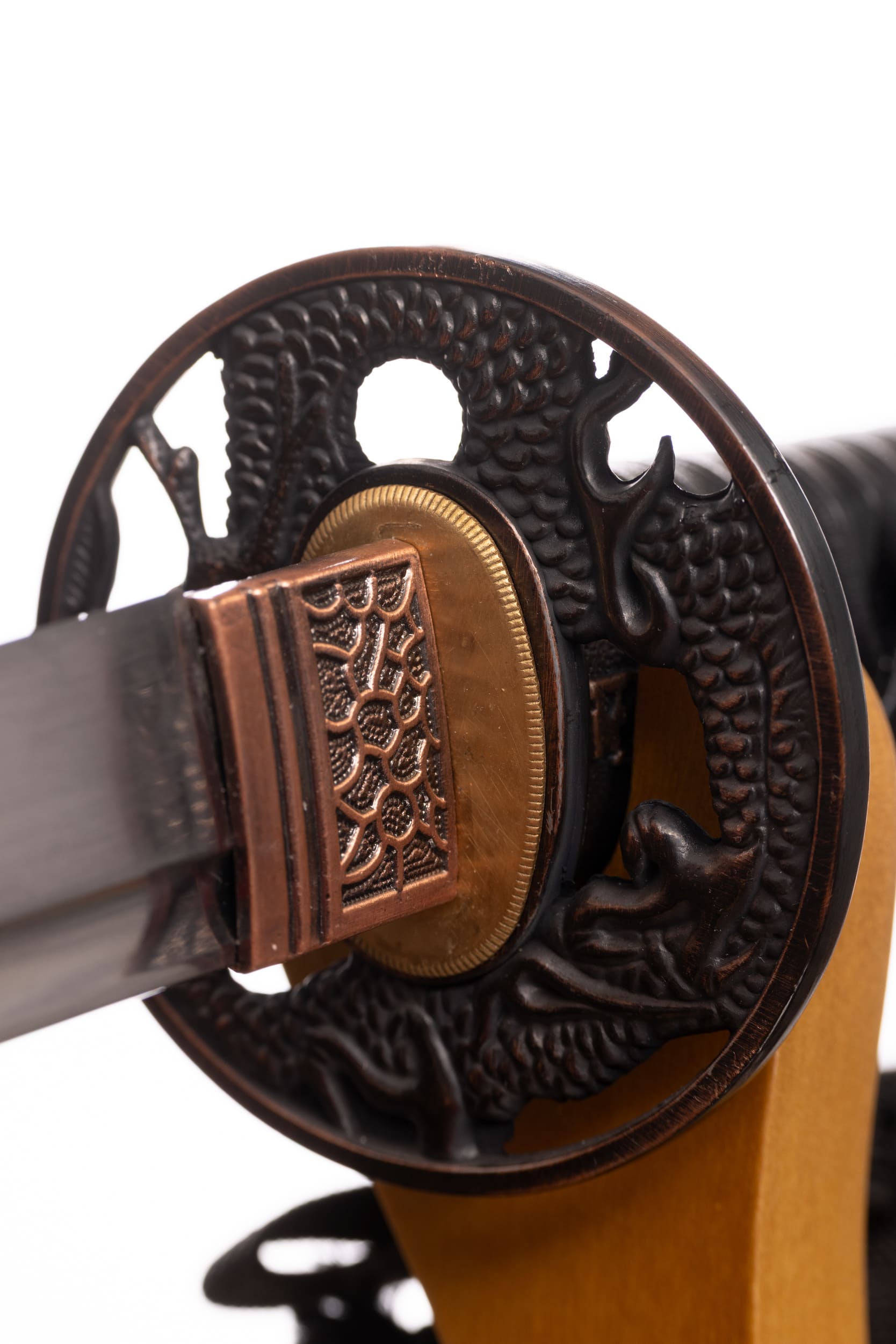 Habaki wykonane z miedzi z komórkowym wzorem. Podkładki seppa zrobione z mosiądzu. Tsuba ażurowa, miedziowana, okrągła, z motywem smoka. Fuchi, kashira i menuki miedziowane, menuki z motywem liści bambusa, fuchi i kashira z kamonem. Pochwa (saya) z drewna magnolii pokryta lśniącą, czarną laką. Sageo bawełniane, czarne.