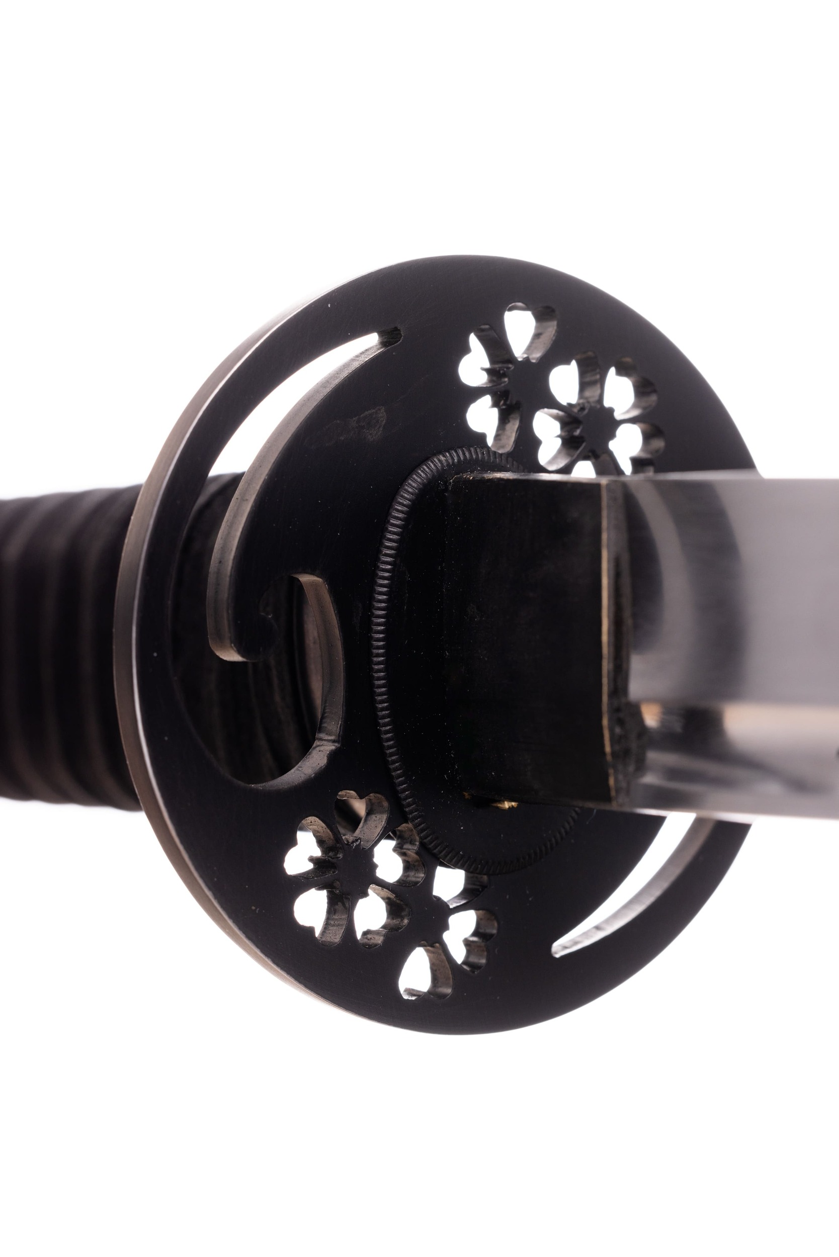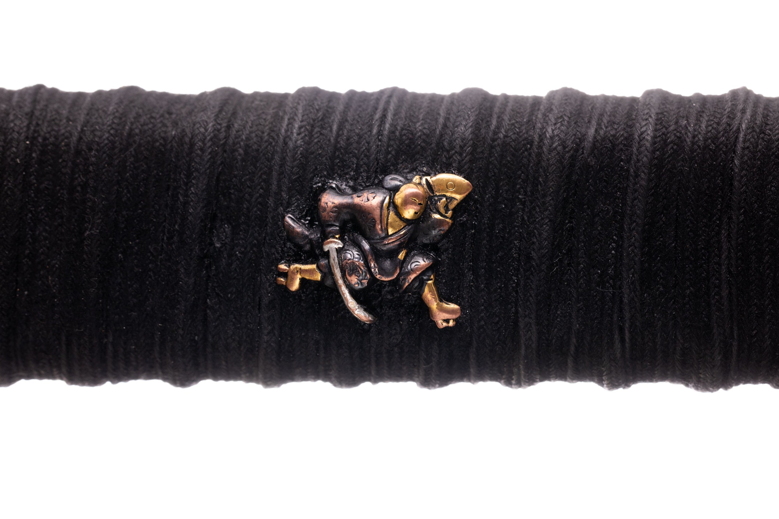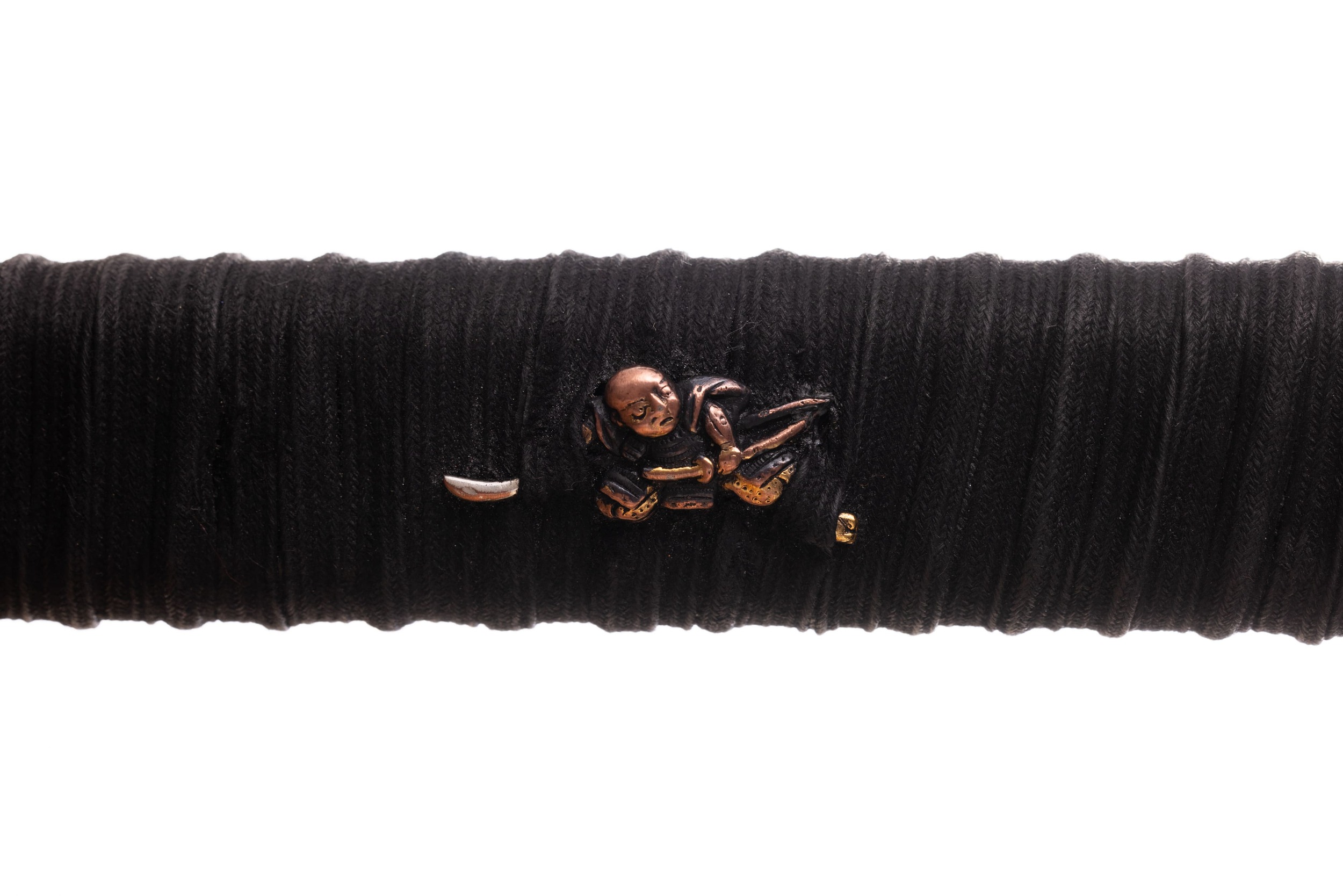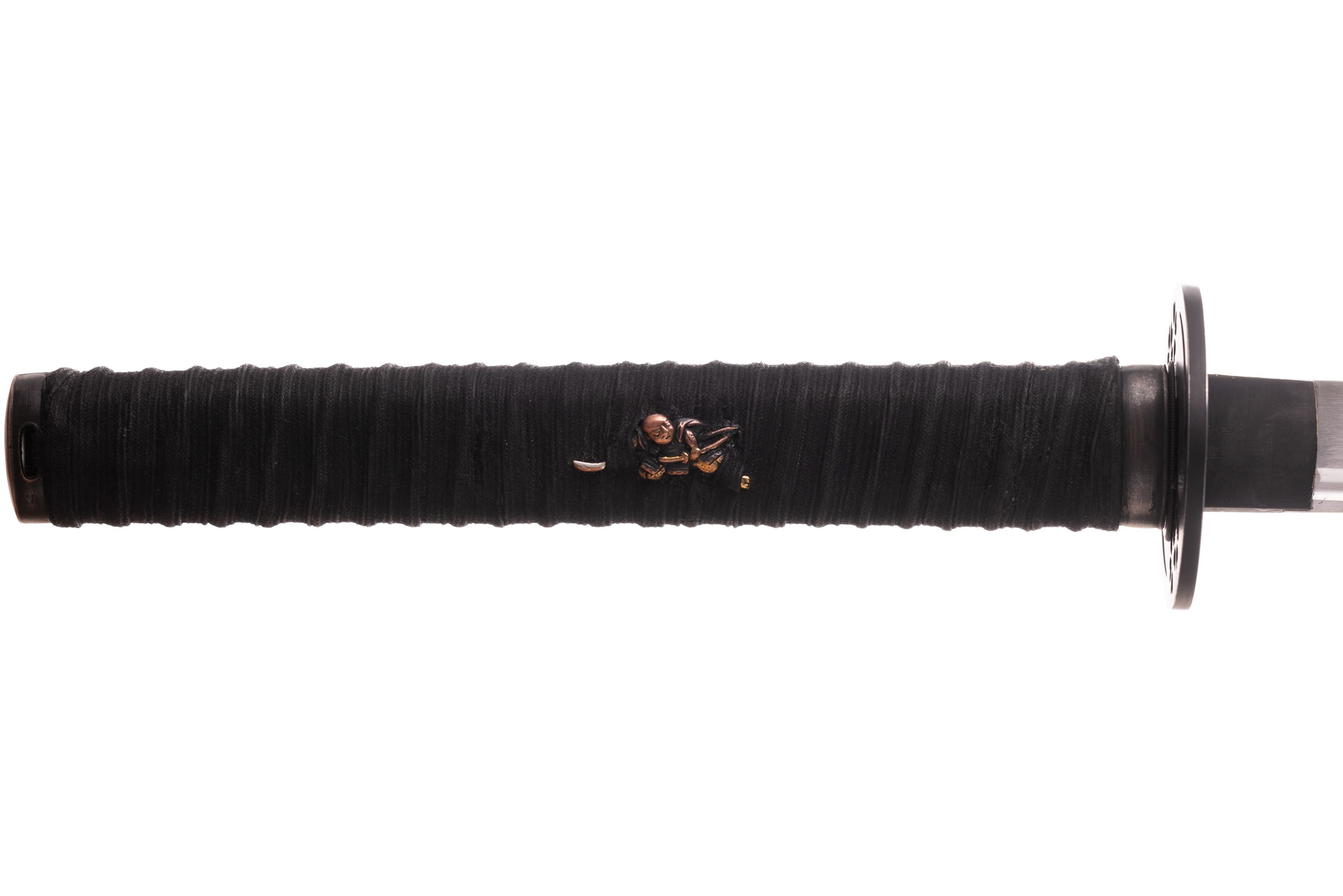 Habaki wykonane z mosiądzu i pomalowane na czarno, podobnie jak seppy. Tsuba stalowa, czarna, okrągła, z ażurowym zdobieniem w formie kwiatów i fali. Fuchi i kashira miedziowane i patynowane. Menuki mosiężne, japońskie, z motywem samurajów. Pochwa (saya) czarna, drewniana, pokryta ratanem, z wykończeniami z rogu. Sageo bawełniane z domieszką poliestru, czarne.