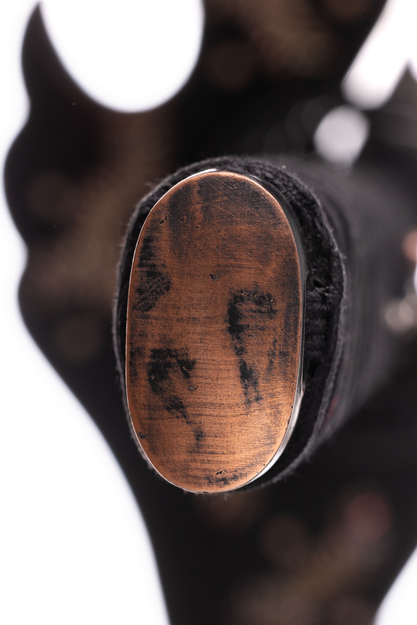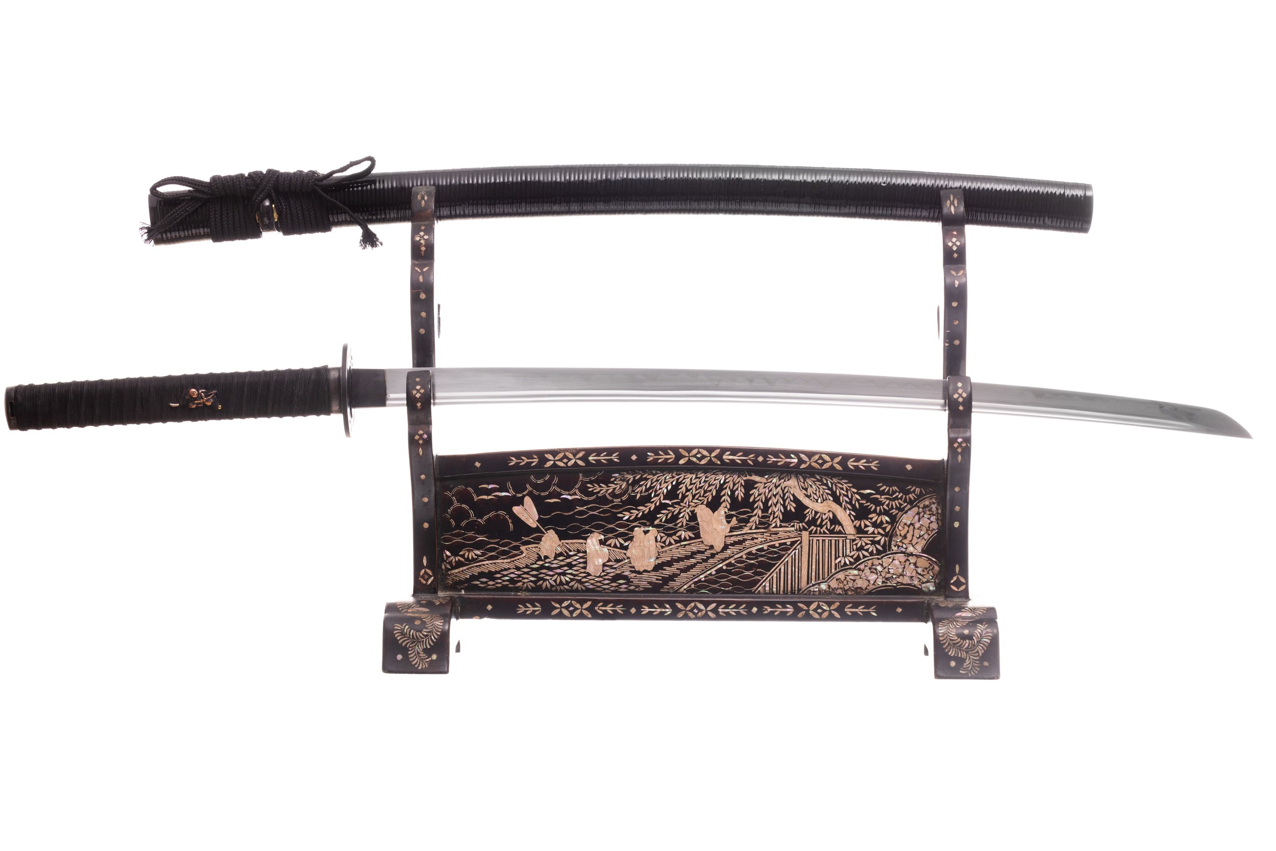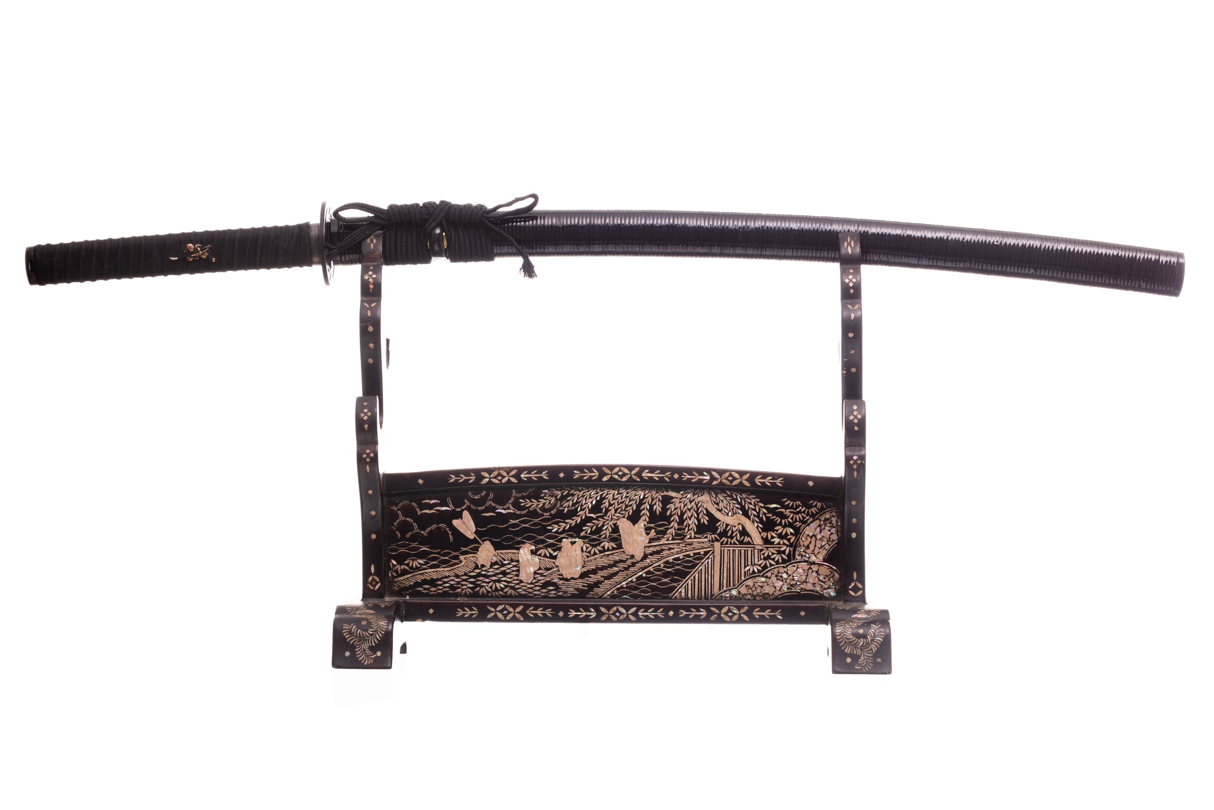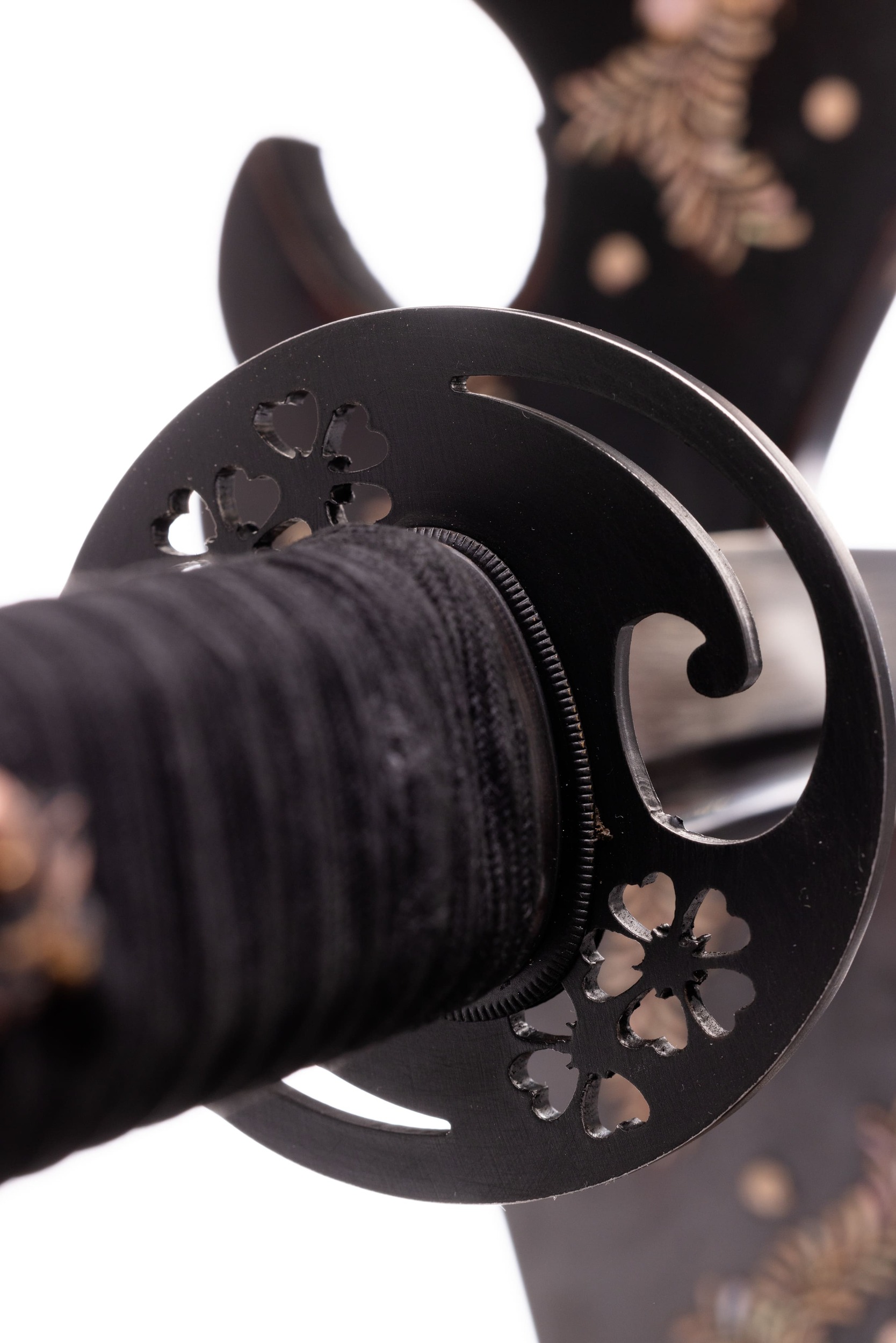Habaki wykonane z mosiądzu i pomalowane na czarno, podobnie jak seppy. Tsuba stalowa, czarna, okrągła, z ażurowym zdobieniem w formie kwiatów i fali. Fuchi i kashira miedziowane i patynowane. Menuki mosiężne, japońskie, z motywem samurajów. Pochwa (saya) czarna, drewniana, pokryta ratanem, z wykończeniami z rogu. Sageo bawełniane z domieszką poliestru, czarne.