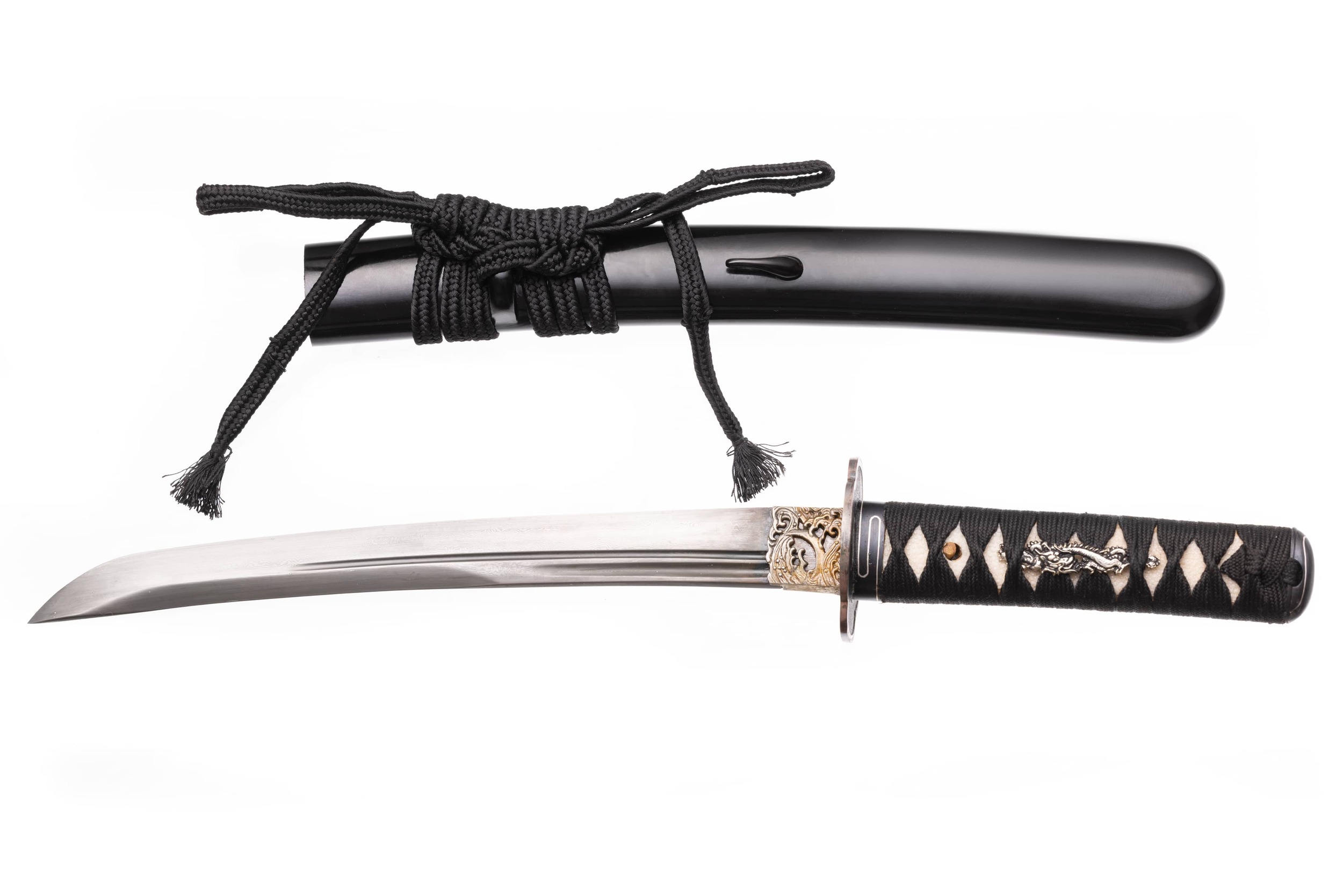 Habaki mosiężne, podobnie jak podkładki (seppa). Mała owalna tsuba żelazna, pomalowana na czarno, z karbowanym rantem. Fuchi i kashira srebrne w kolorze, z motywem monu boga wojny Hajimana. Menuki z tego samego materiału, z motywem smoka. Pochwa (saya) tego tanto jest drewniana, pokryta lśniącą czarną laką, bez zdobień, ze złotym, jedwabnym sageo.