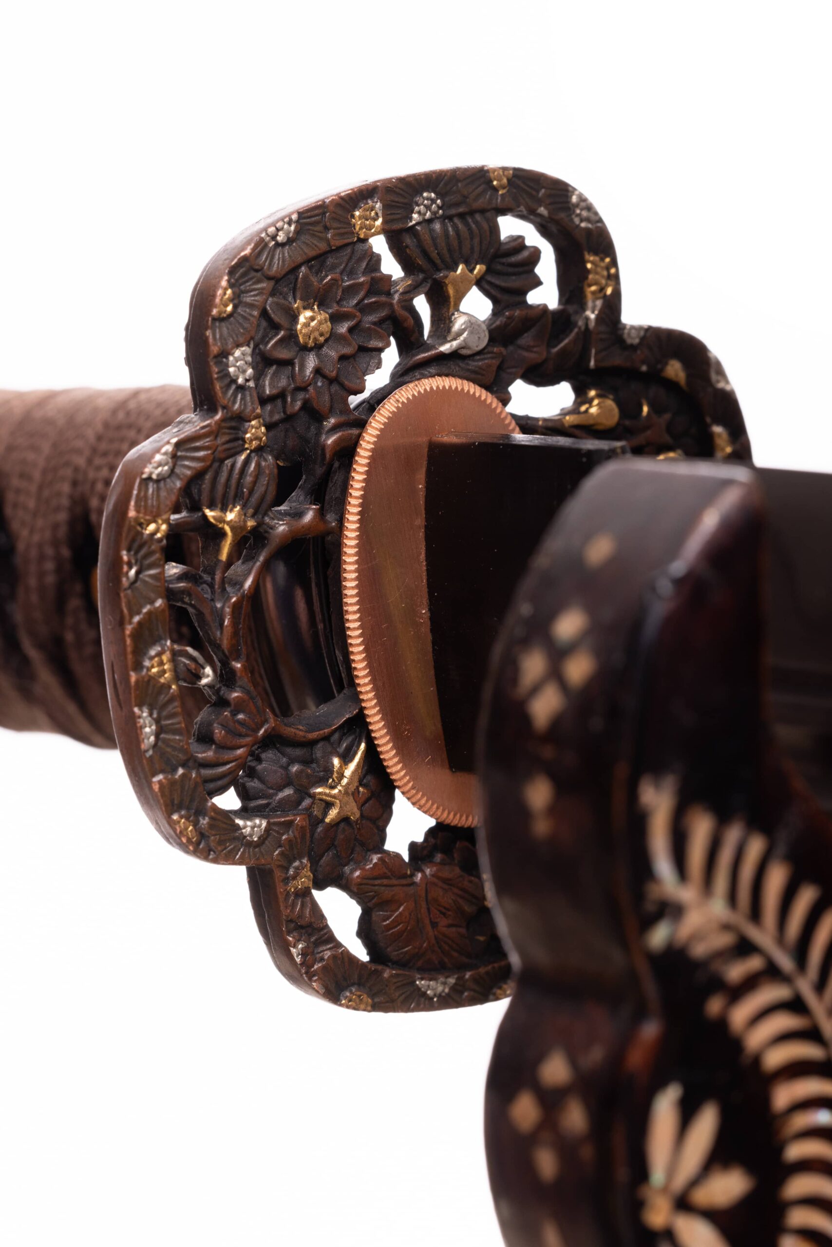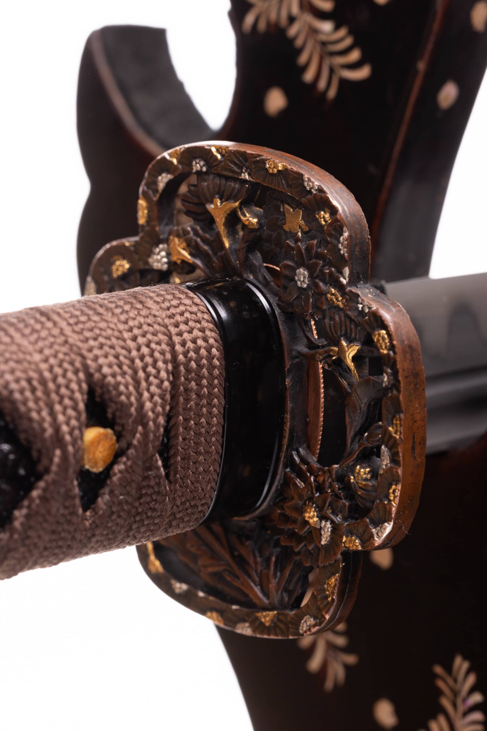 Habaki wykonane z mosiądzu (pomalowane na czarno). Podkładki seppa wykonane z miedzi. Tsuba mosiężna, ażurowa, w typie mokkko, z motywem florystycznym. Fuchi i kashira stalowe, pomalowane na czarno. Menuki mosiężne, czarne, z motywem smoka. Pochwa (saya) czarna, drewniana, ze wzmocnieniem kizami z czarnej same-gawa, z wykończeniami z rogu.
