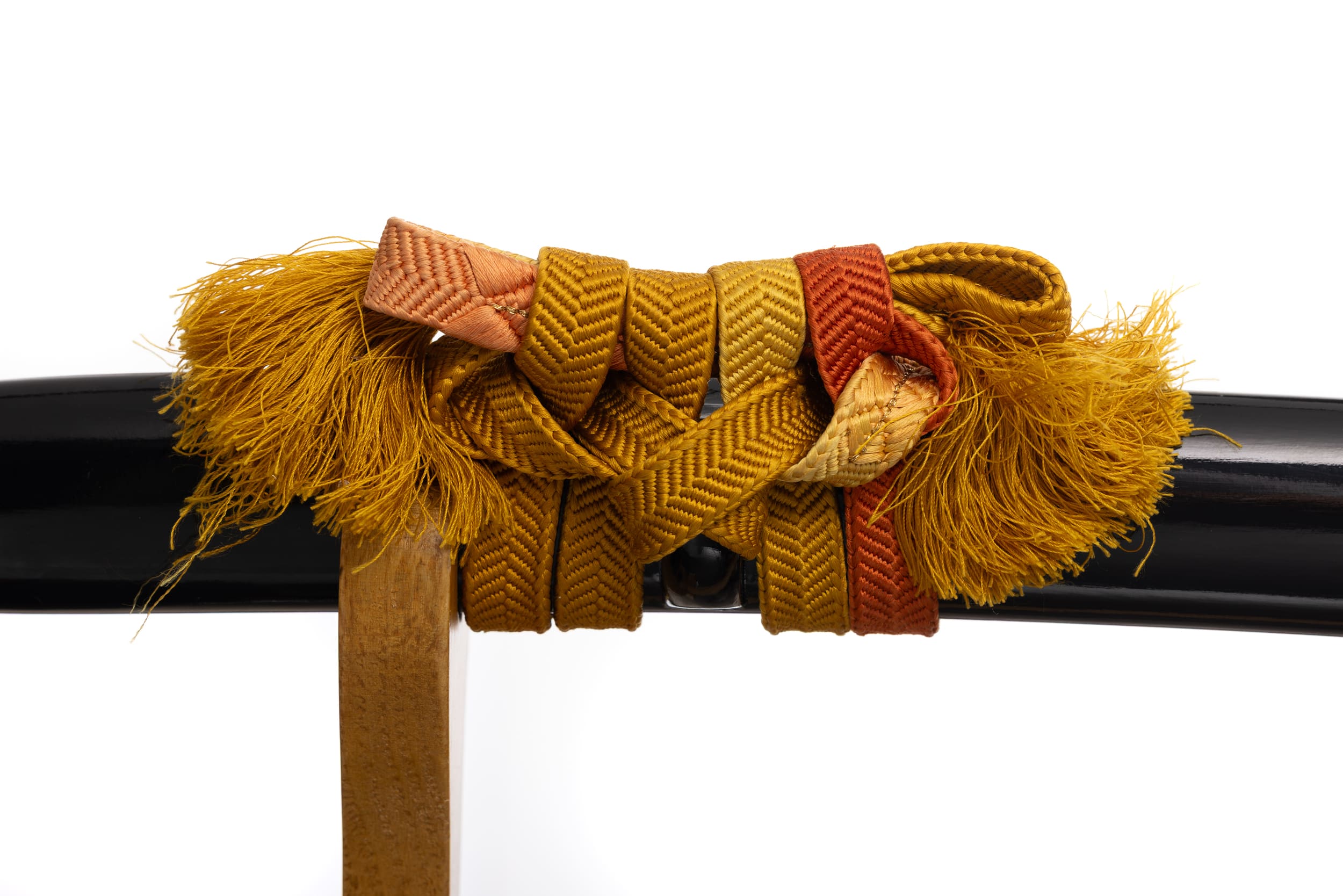 Habaki mosiężne bez zdobień. Podkładki seppa z tego samego materiału. Tsuba ażurowa, w typie musashi, czarna, stalowa. Fuchi, kashira miedziowane z motywem monu boga wojny hajimana, menuki w formie monet keszowych (typowe dla mieczy używanych w rebelii satsuma). Pochwa (saya) z drewna magnolii pokryta lśniącą czarną laką, z ozdobnym zdobieniem przy końcu z motywem kamonu. Sageo żółto-pomarańczowe, jedwabne, japońskie.