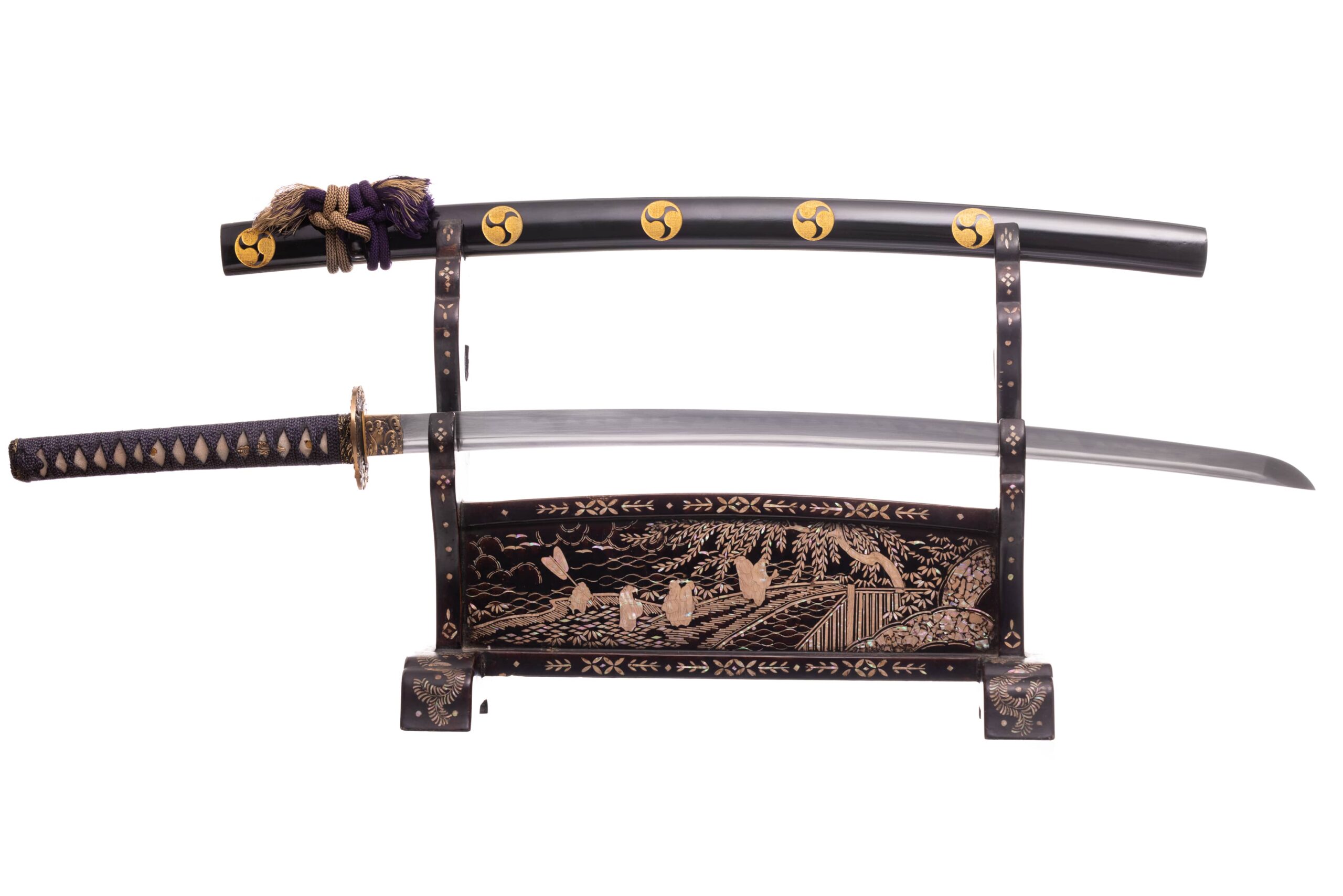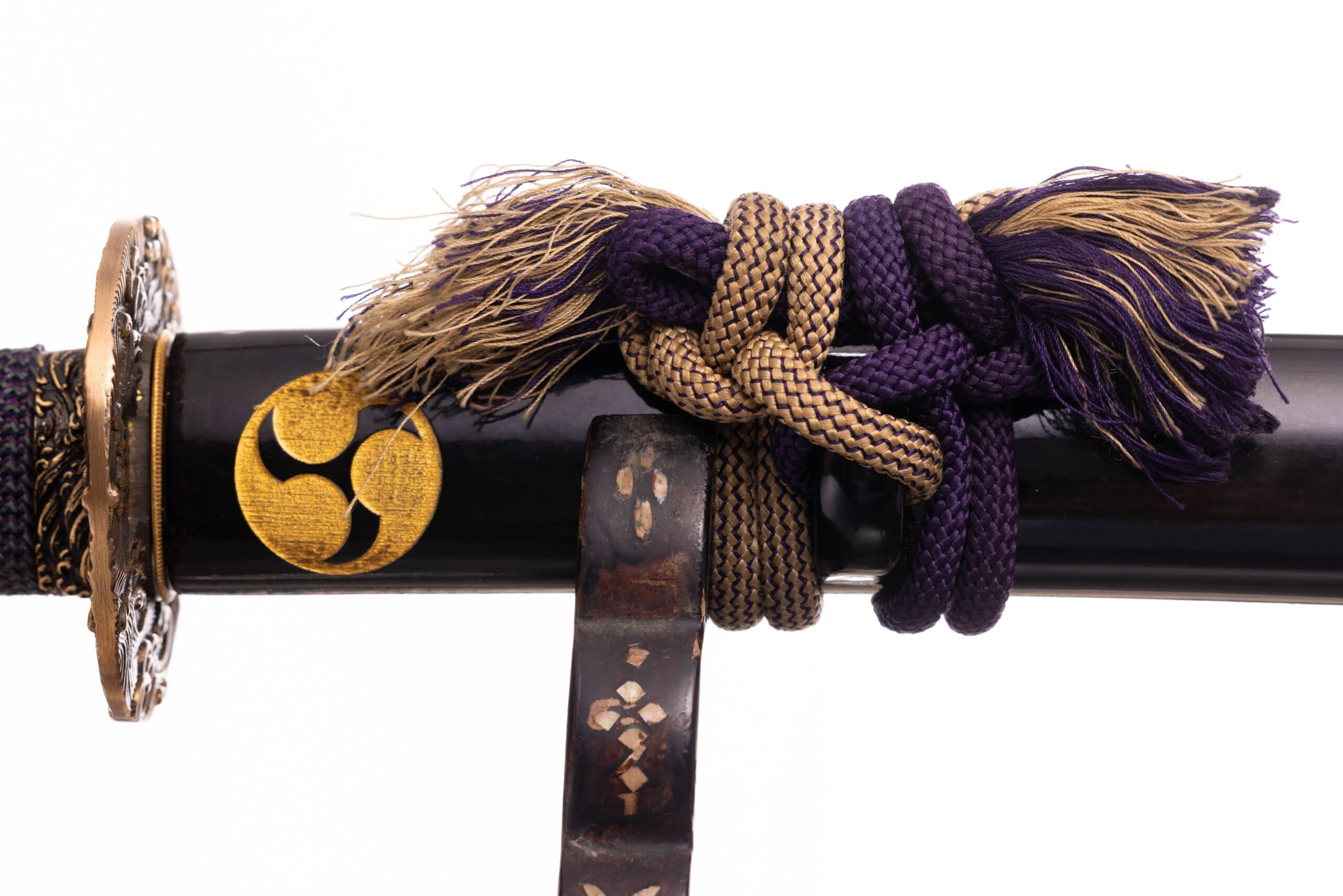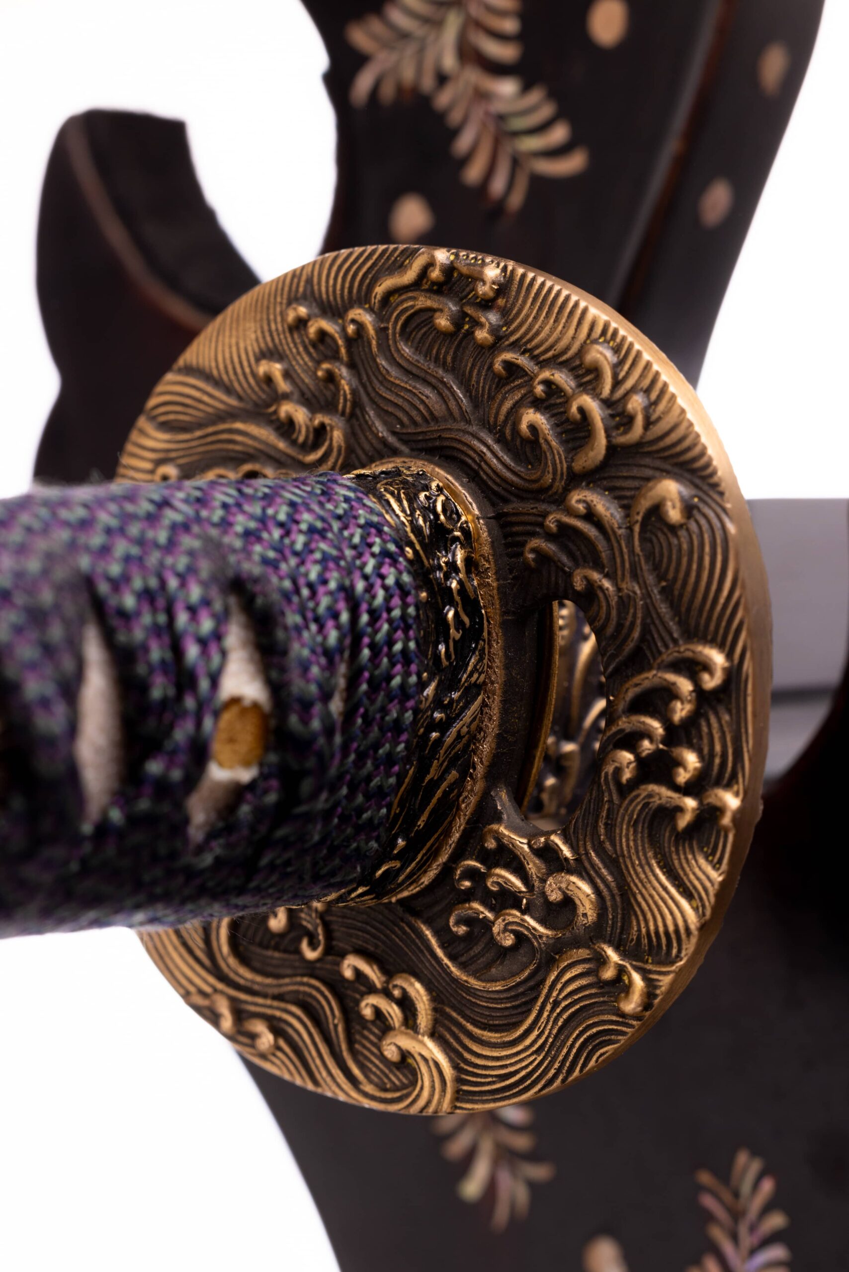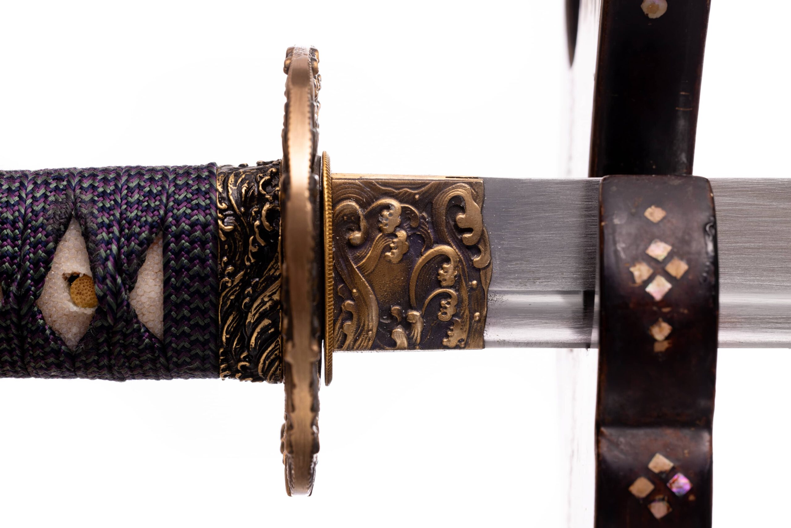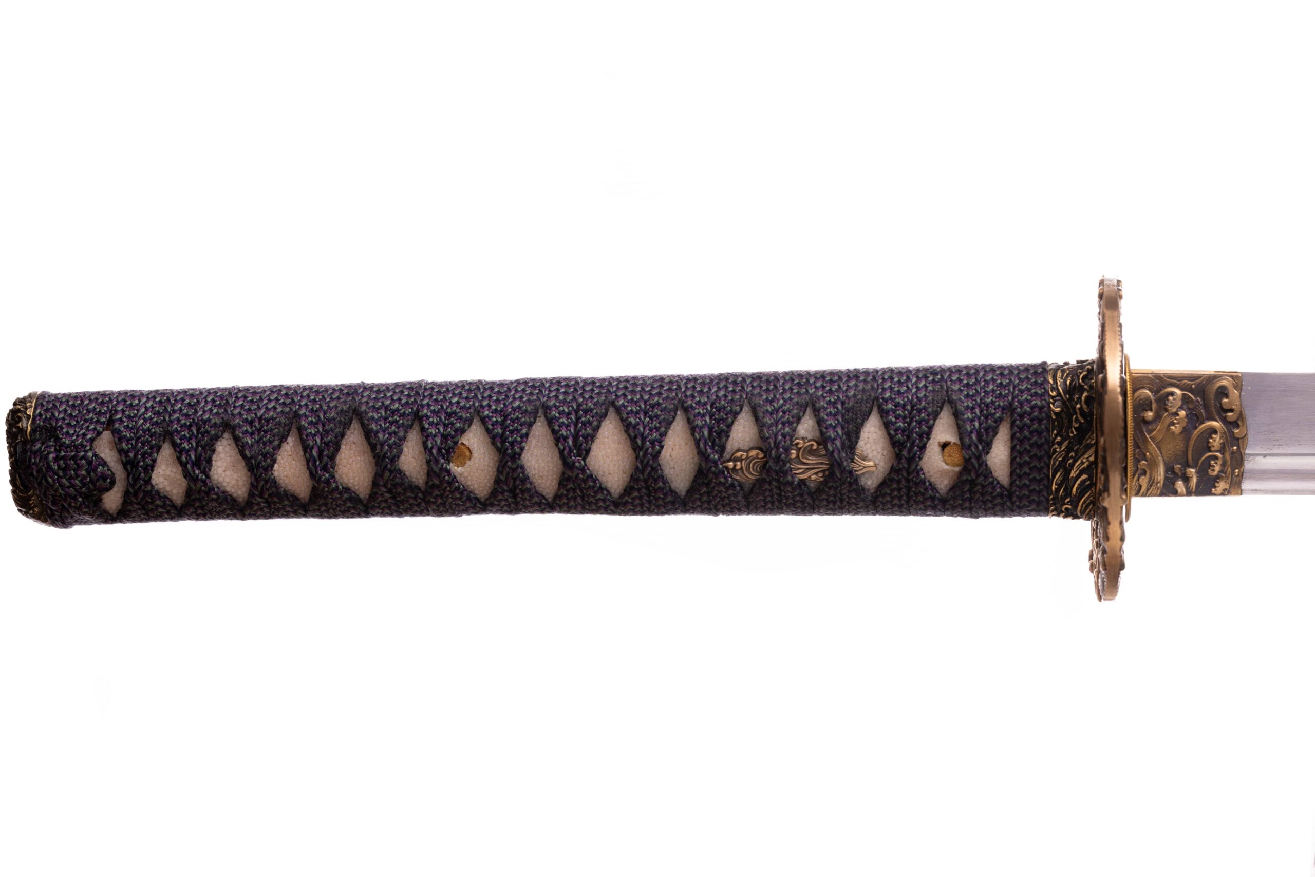Habaki wykonane z mosiądzu, rzeźbione w morskie fale. Podkładki seppy również wykonane z mosiądzu. Tsuba mosiężna, pełna, owalna, również z motywem morskiej fali. Fuchi , kashira i menuki z tego samego materiału i z analogicznym motywem. Pochwa (saya) czarna, drewniana, rzeźbiona w mony hajimana. Sageo wykonane z jedwabiu, japońskie, dwukolorowe (fioletowo-beżowe).