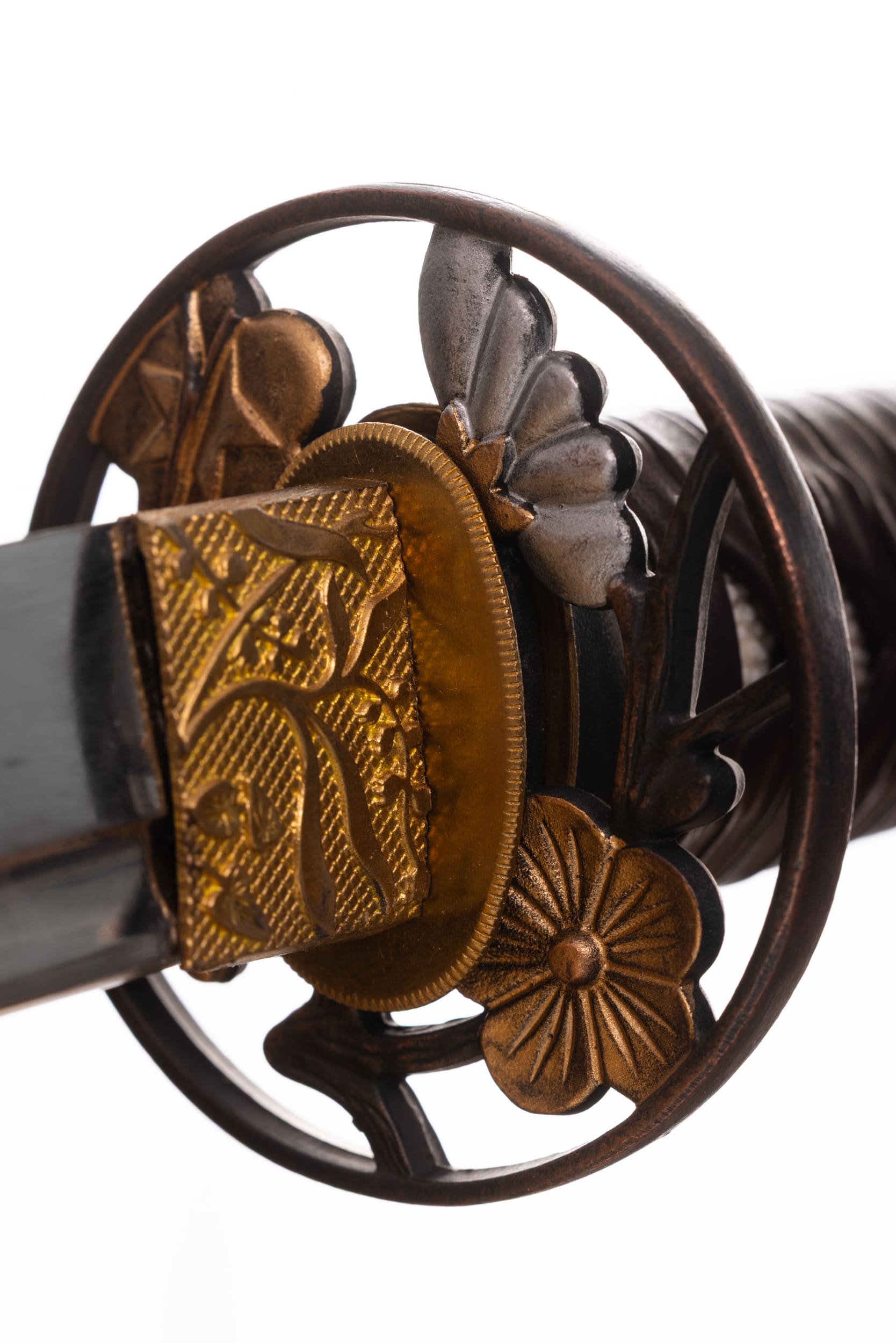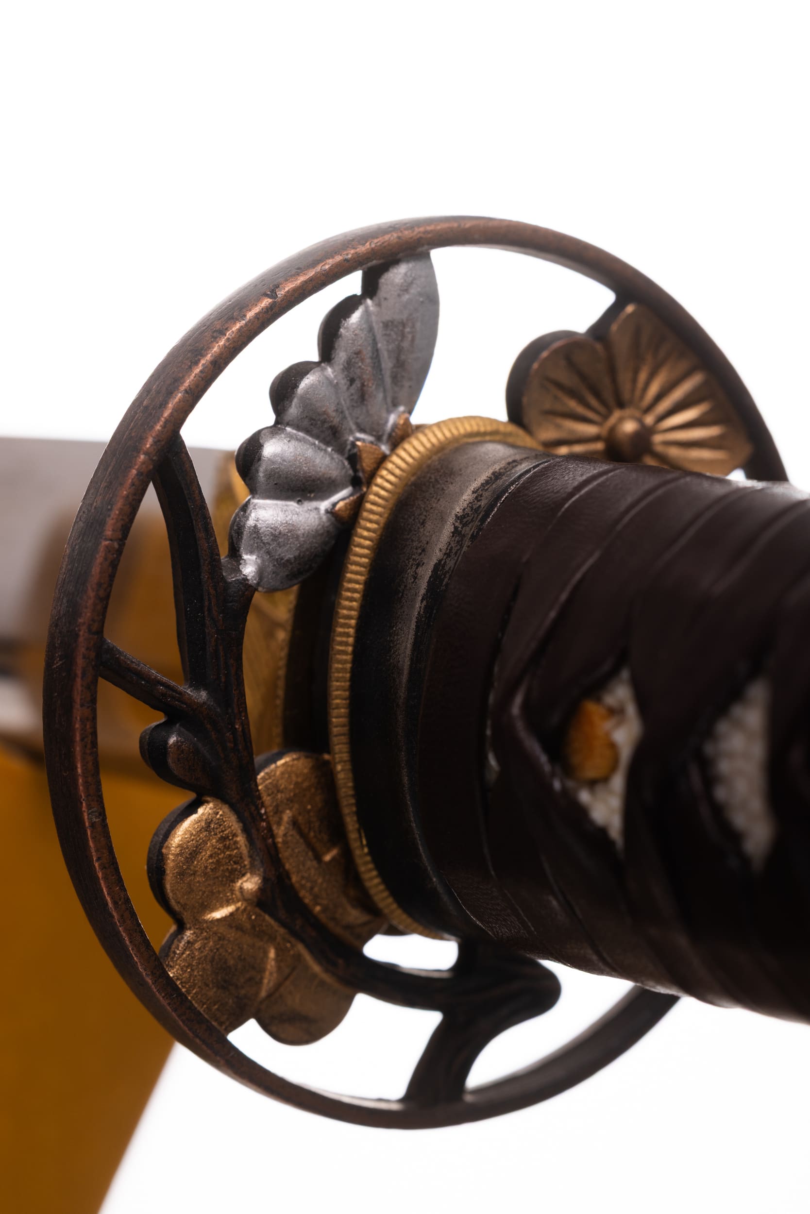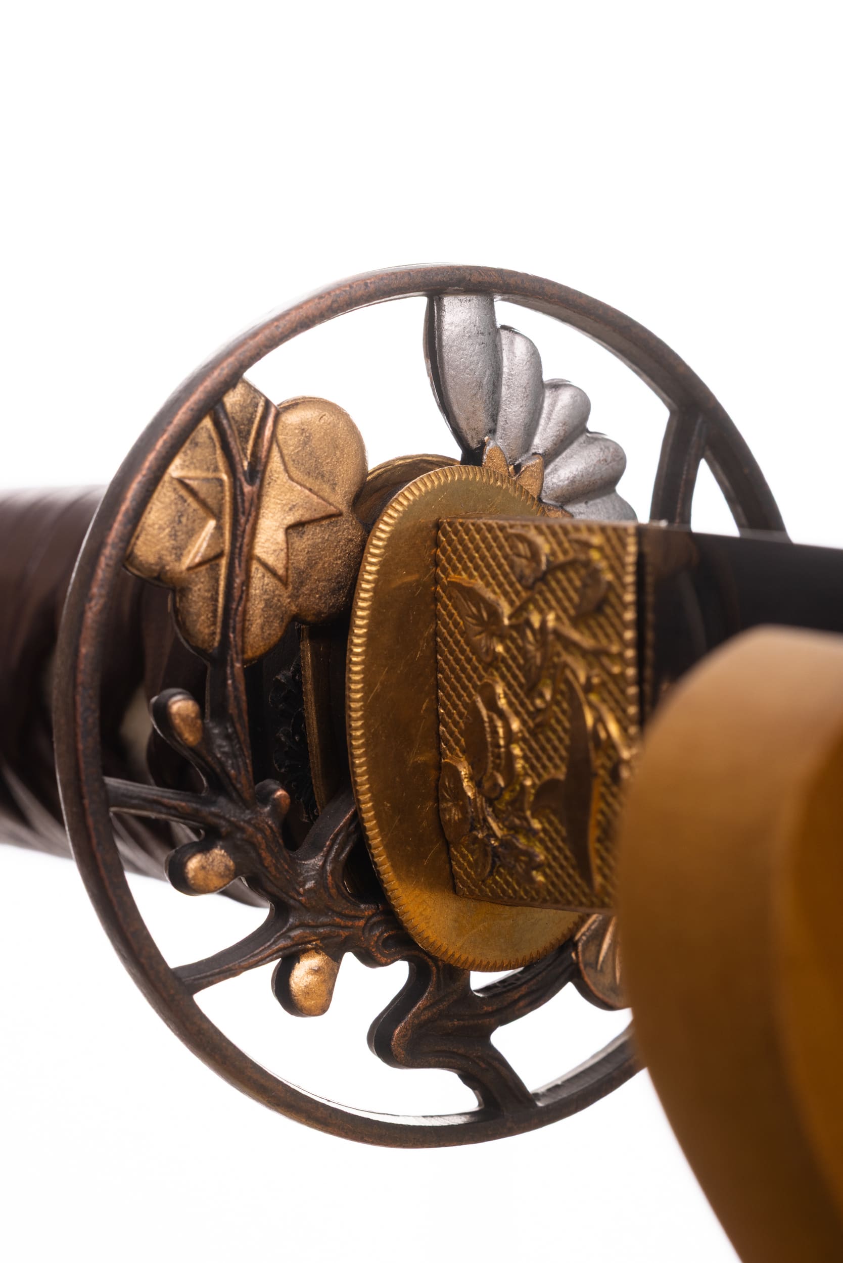 Habaki mosiężne ze zdobieniem z motywem florystycznym. Podkładki seppa z tego samego materiałów. Tsuba ażurowa, w typie sukkashi, okrągła, z motywem kwiatów wiśni. Fuchi, kashira stalowe z tym samym motywem, menuki w formie strażników świątyni Nio. Pochwa (saya) z drewna magnolii pokryta lśniącą bordową laką, ze zdobieniem w formie kwiatów chryzantemy, płaskorzeźbionym. Sageo złoto-różowe z motywem kwiatowym, jedwabne, japońskie.