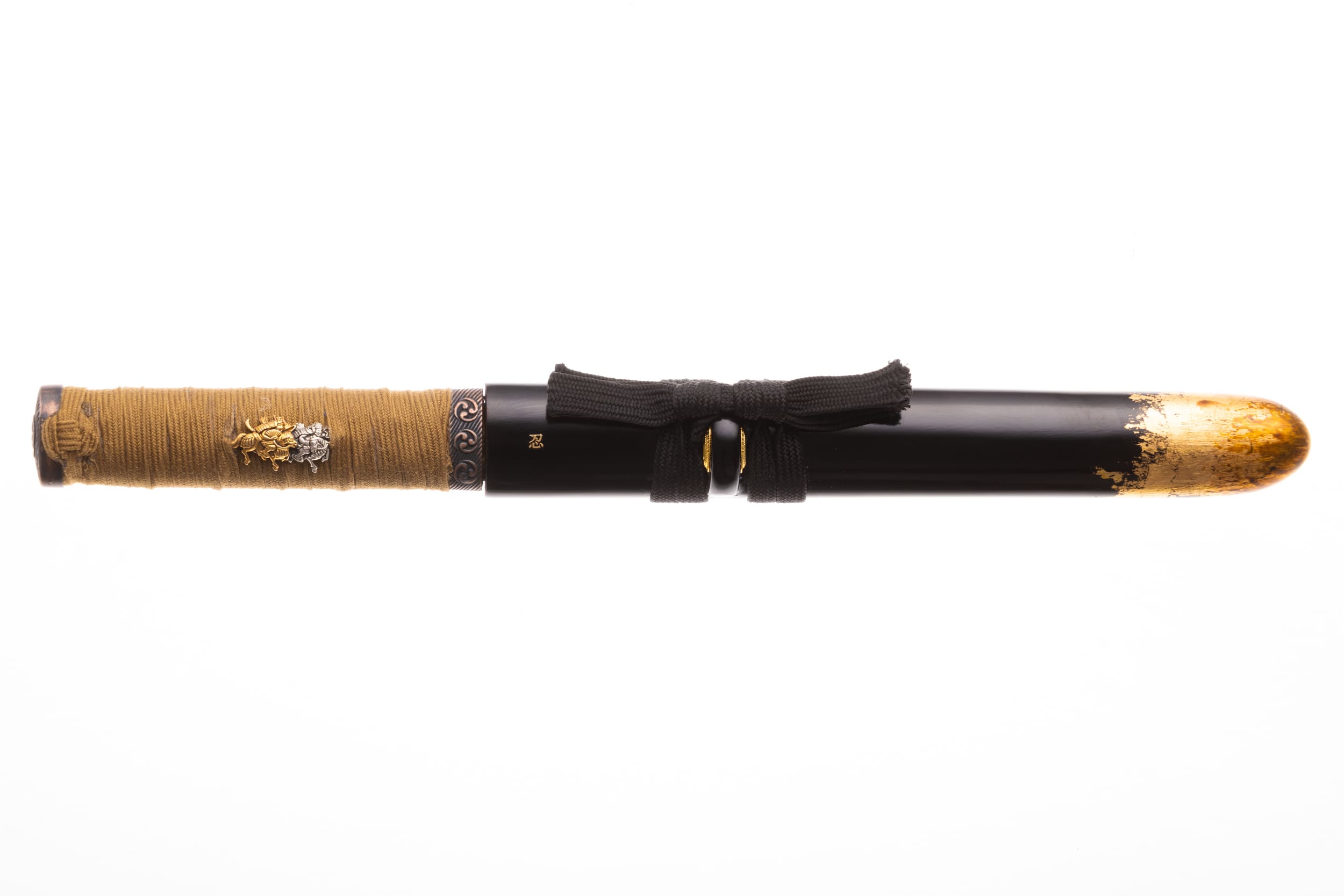 Habaki z mosiądzu. Tsuba brak ostrze oprawione w typie aikuchi. Fuchi i kashira miedziowane, z motywem monu boga wojny hajimana. Menuki z motywem konnych samurajów. Pochwa (saya) drewniana z pokryta lśniącą czarną laką ze złoceniem przy końcu. Taśma sageo czarna z bawełny z domieszką poliestru.