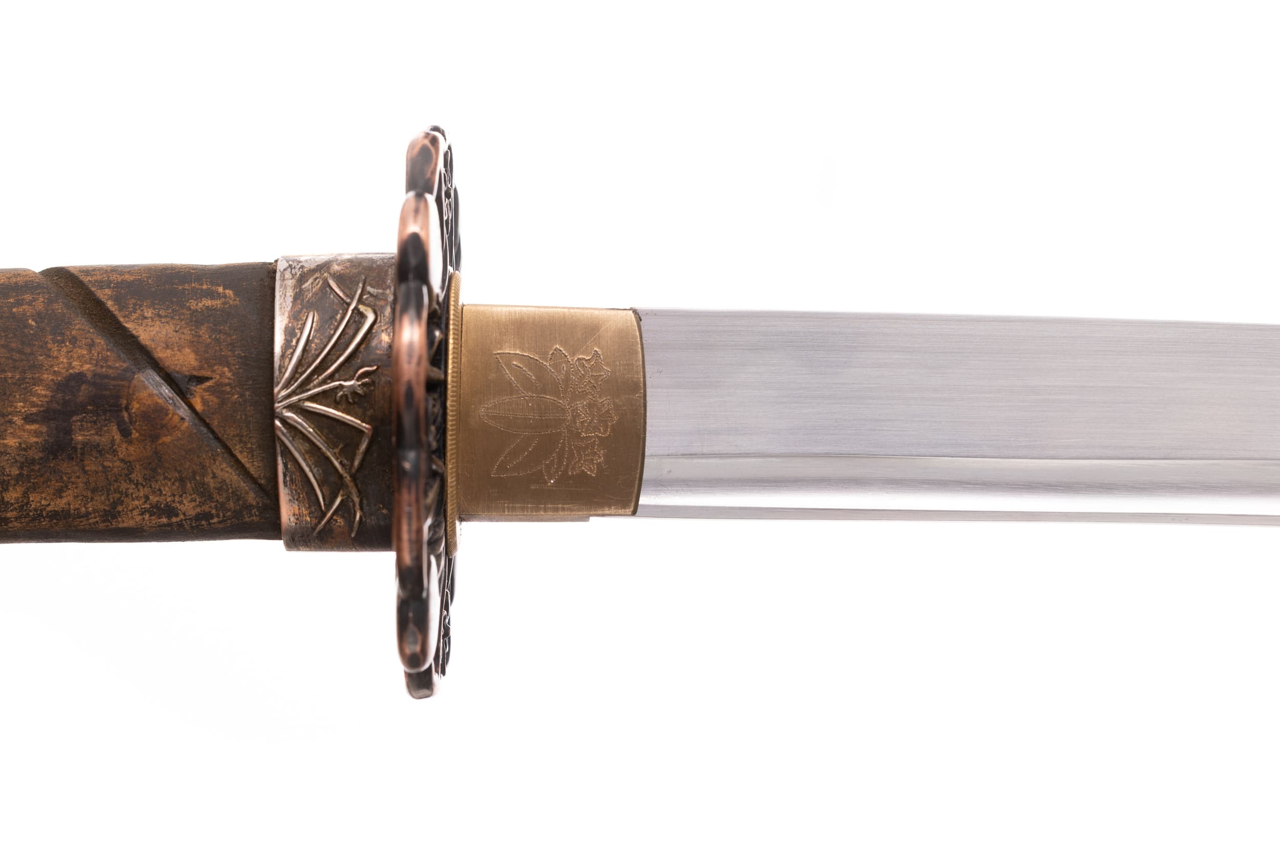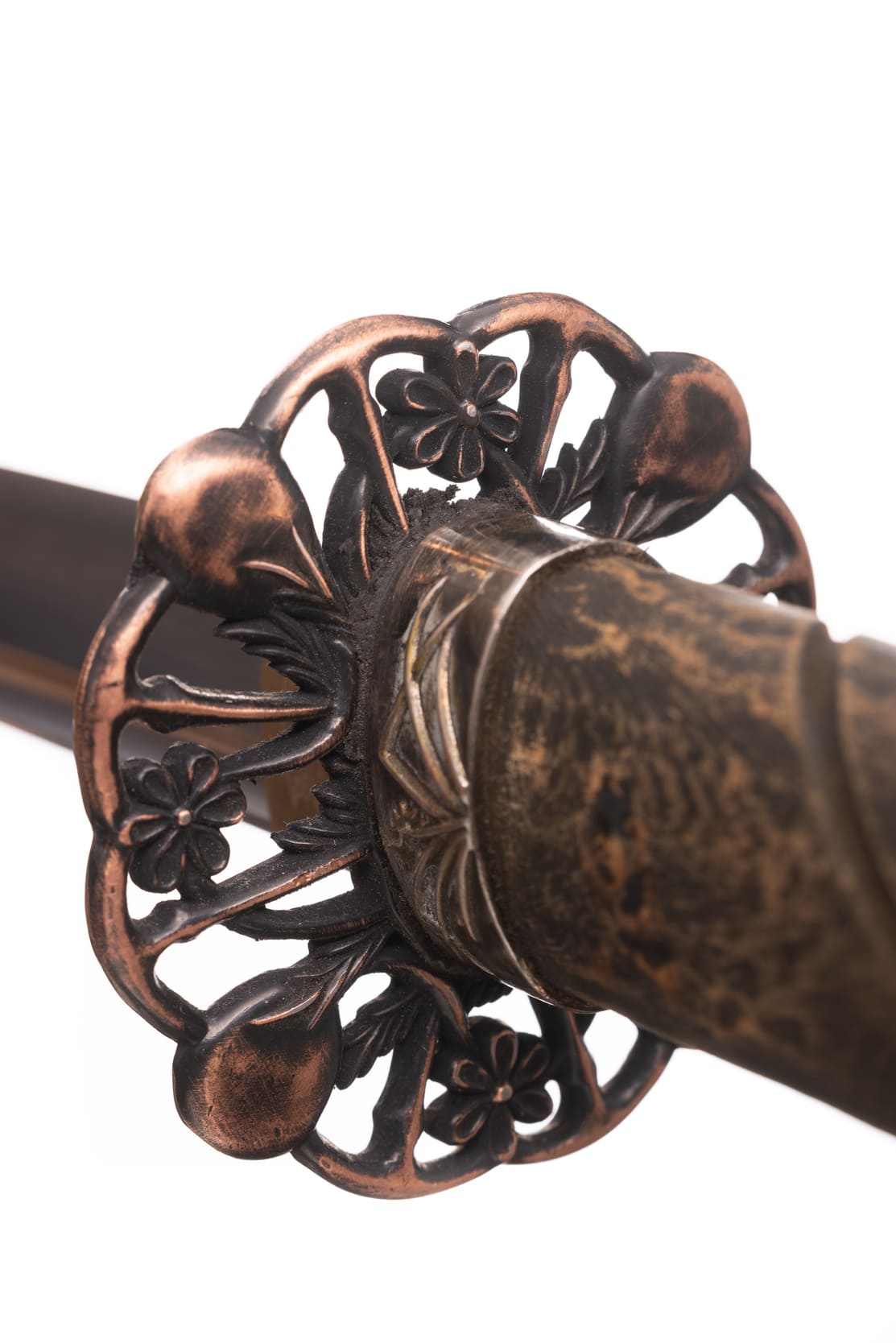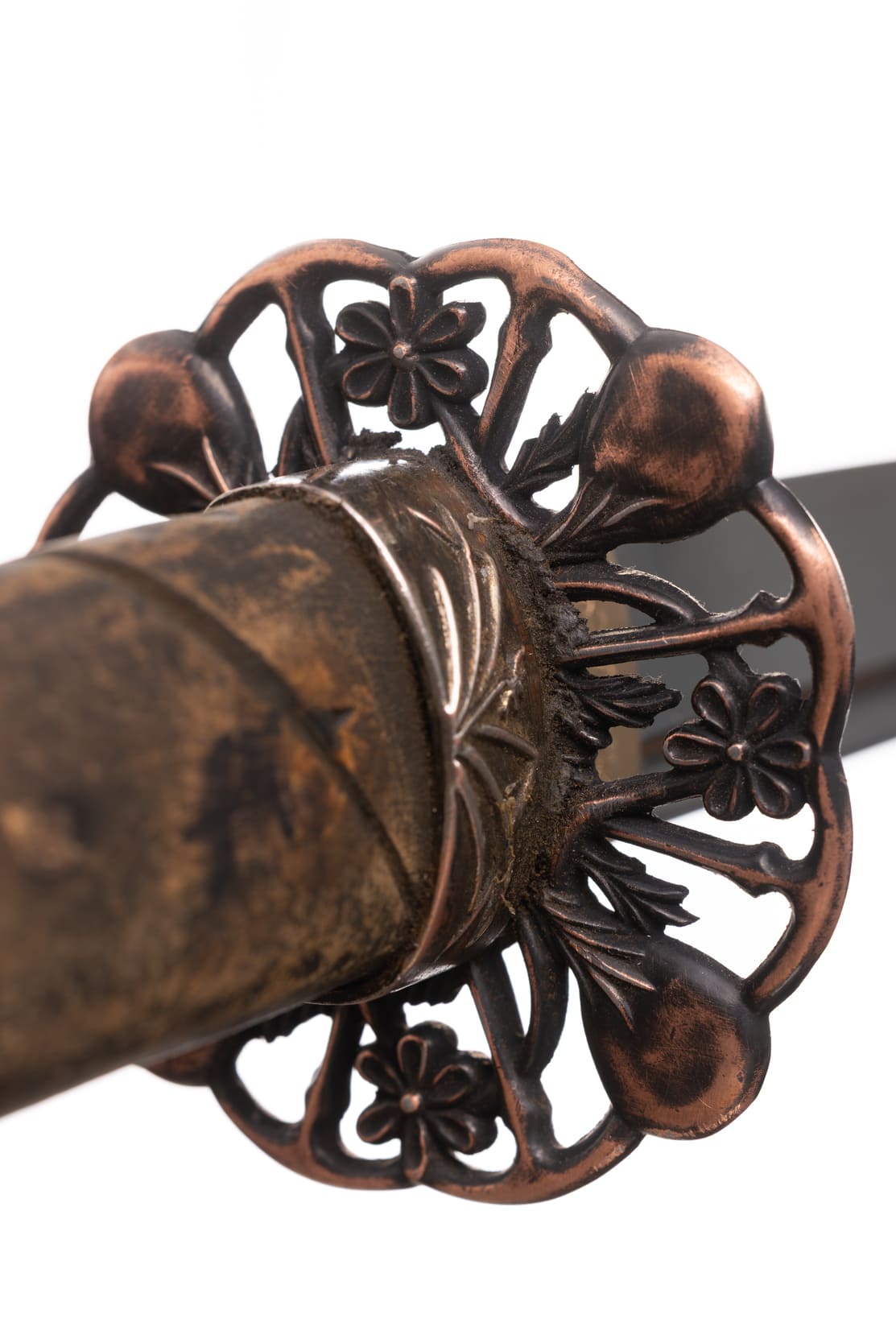 Habaki z mosiądzu, ozdobione monem z motywem kwiatu babki wodnej. Seppy z tego samego materiału. Tsuba ażurowa, okrągła, z miedziowanego brązu, z motywem florystycznym. Fuchi, kashira z brązu z analogicznym motywem. Menuki z mosiądzu w formie smoków. Pochwa (saya) drewniana, pokryta bejcą i lakierem bez barwnym z rzeźbieniem w formie spirali zarówno na rękojeści jaki i pochwie. Saya przewiązana jedwabną, japońską, wielokolorową taśmą sageo.
