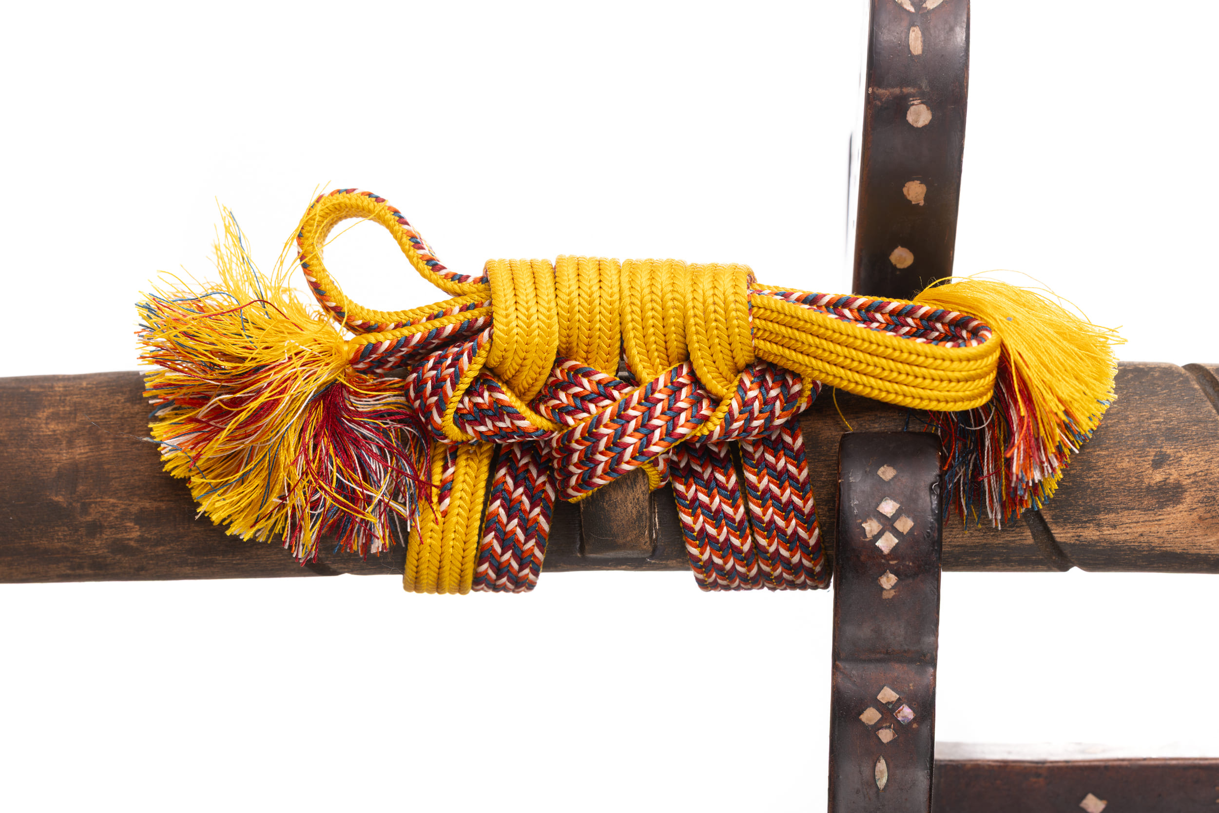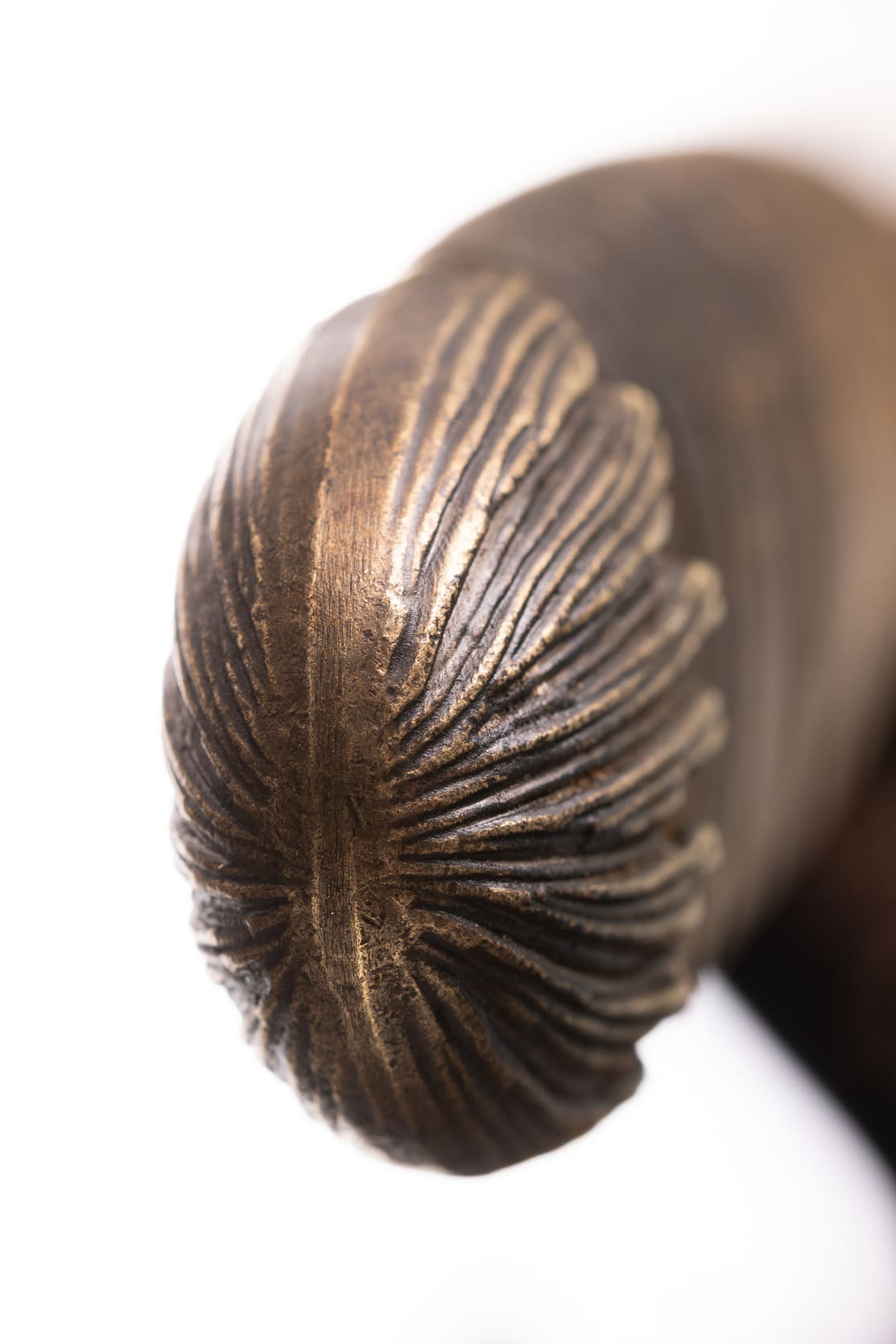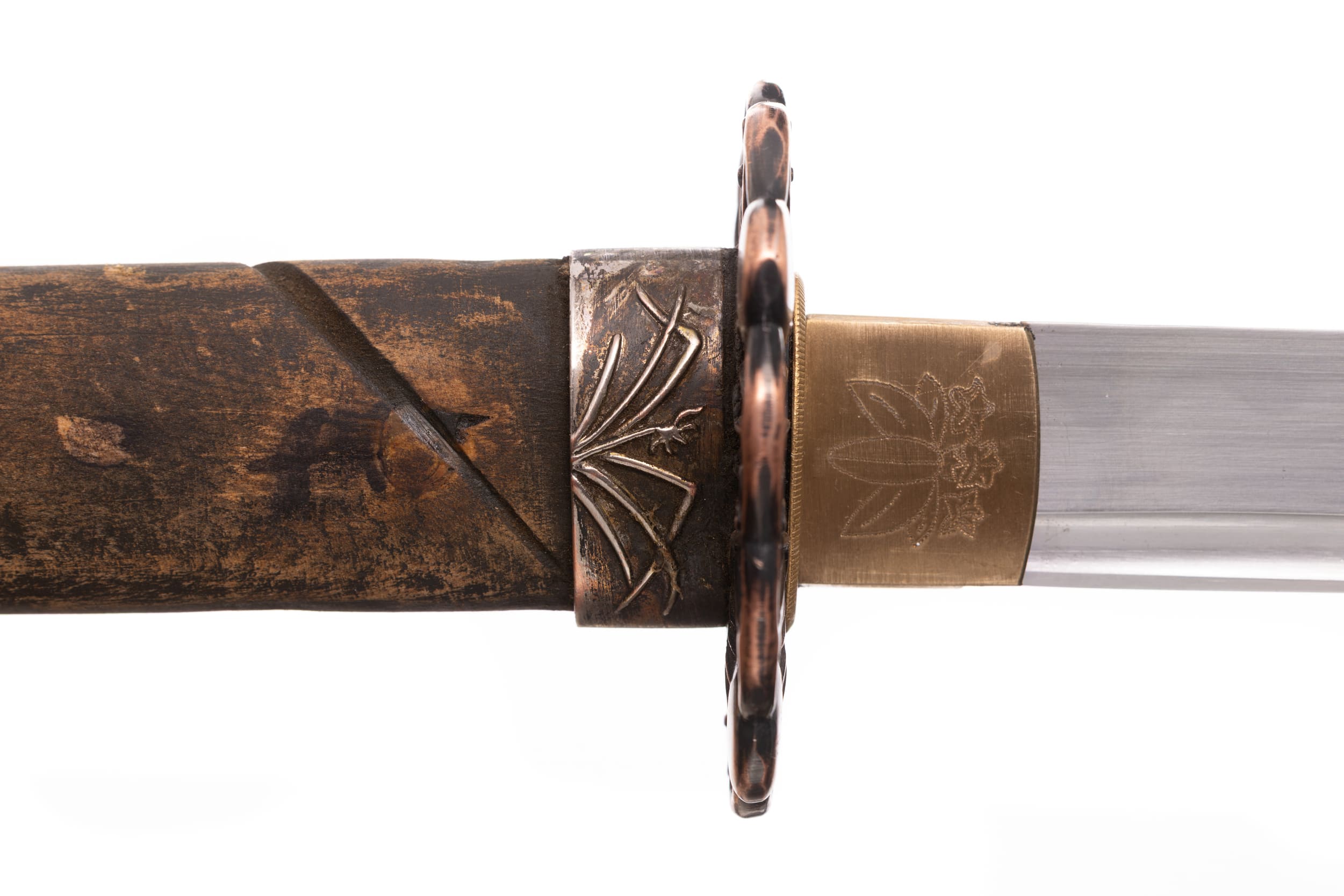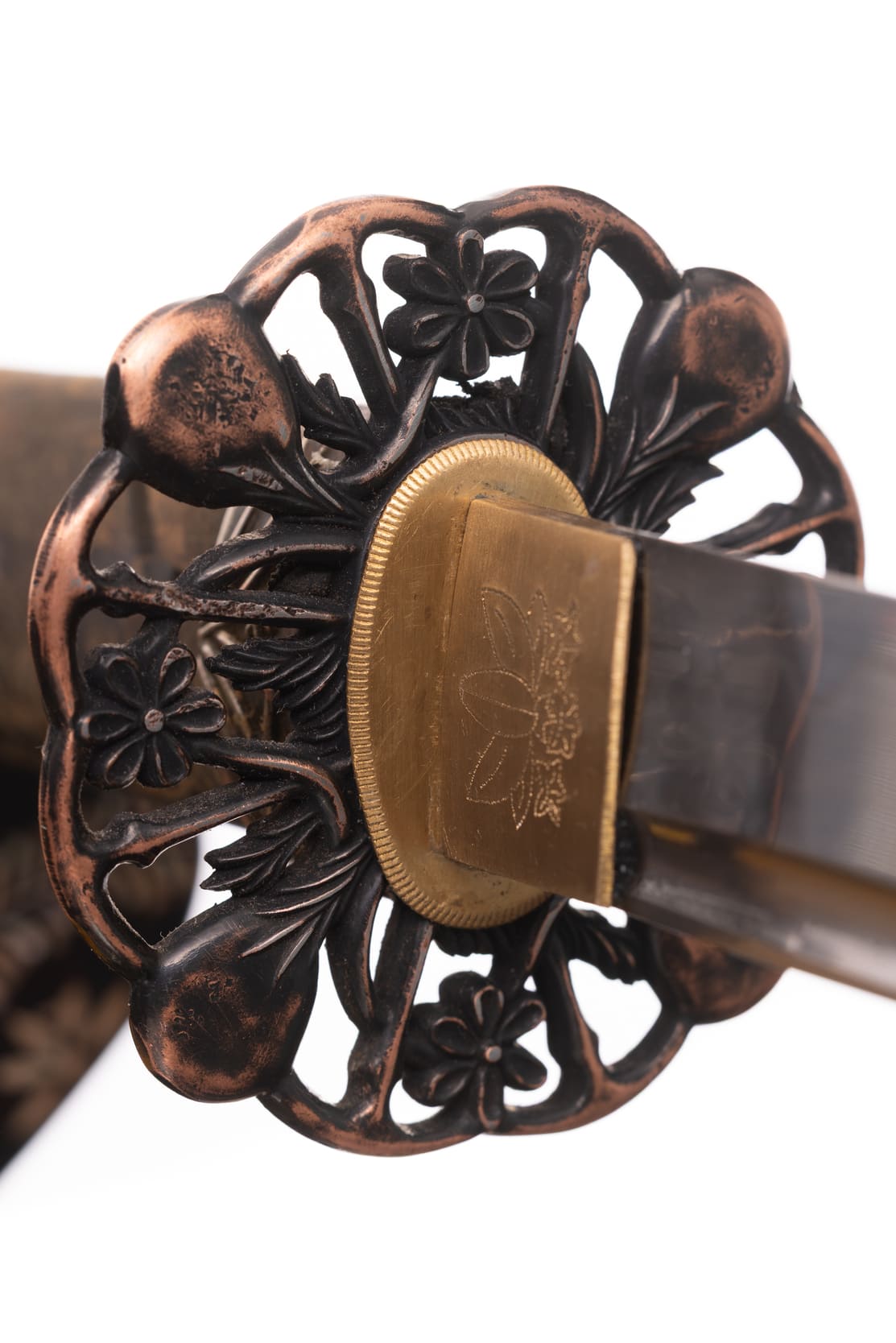 Habaki z mosiądzu, ozdobione monem z motywem kwiatu babki wodnej. Seppy z tego samego materiału. Tsuba ażurowa, okrągła, z miedziowanego brązu, z motywem florystycznym. Fuchi, kashira z brązu z analogicznym motywem. Menuki z mosiądzu w formie smoków. Pochwa (saya) drewniana, pokryta bejcą i lakierem bez barwnym z rzeźbieniem w formie spirali zarówno na rękojeści jaki i pochwie. Saya przewiązana jedwabną, japońską, wielokolorową taśmą sageo.